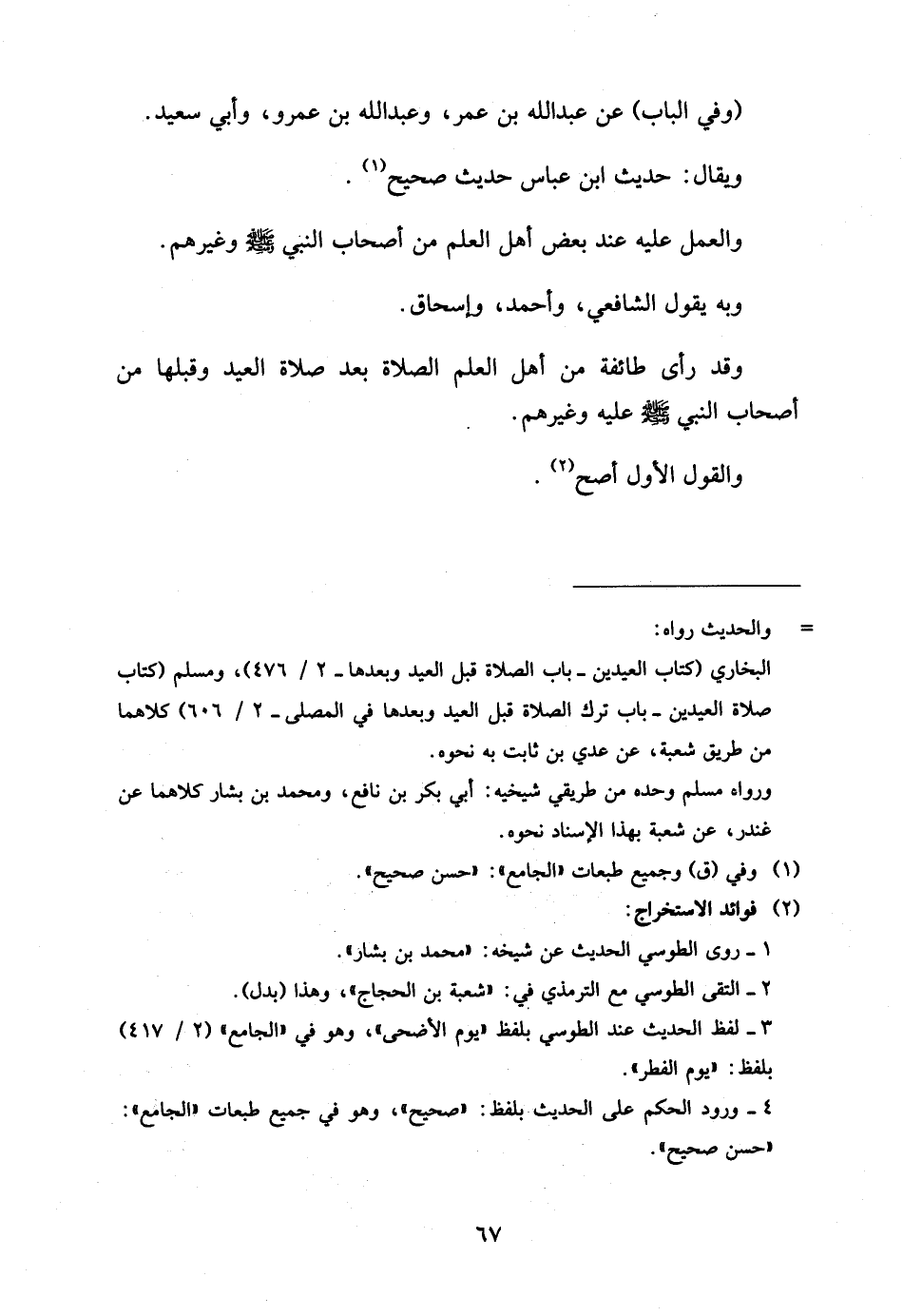 وَقَدْ رَأَى طَائِفَةٌ مِنْ أَهْلِ الْعِلْمِ الصَّلاةَ بَعْدَ صَلاةِ الْعِيدِ وَقَبْلَهَا مِنْ أَصْحَابِ النَّبِيِّ صَلَّى اللَّهُ عَلَيْهِ وَسَلَّمَ عَلَيْهِ وَغَيْرِهِمْ