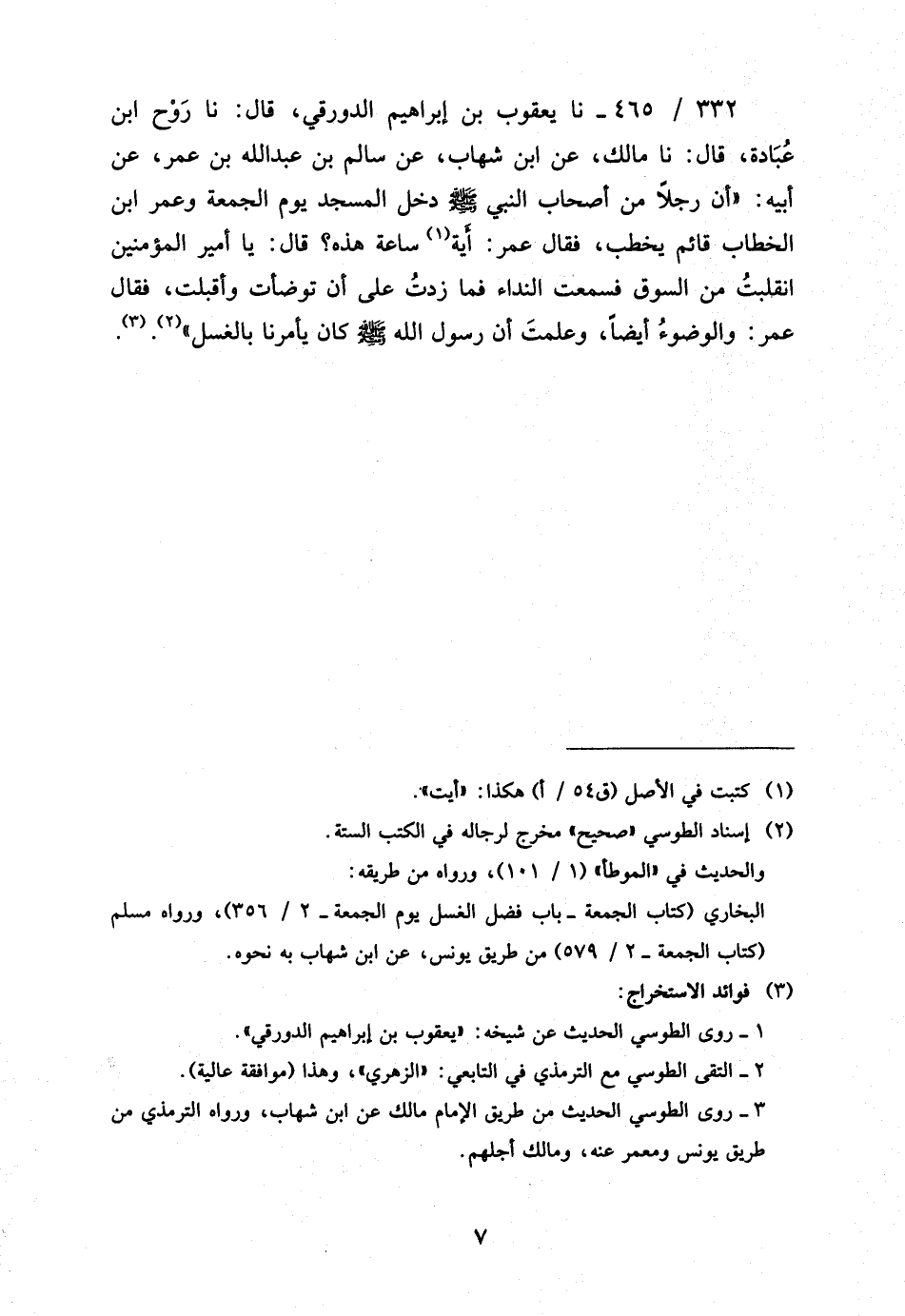 332 - / 465 نَا يَعْقُوبُ بْنُ إِبْرَاهِيمَ الدَّوْرَقِيُّ قَالَ نَا روح ابْن عُبَادَةَ قَالَ نَا مَالِكٌ عَنِ ابْنِ شِهَابٍ عَنْ سَالِمِ بْنِ عَبْدِ اللَّهِ بْنِ عُمَرَ عَنْ أَبِيهِ أَنَّ رَجُلًا مِنْ أَصْحَابِ النَّبِيِّ صَلَّى اللَّهُ عَلَيْهِ وَسَلَّمَ دَخَلَ الْمَسْجِدَ يَوْمَ الْجُمُعَة وَعمر ابْن الْخَطَّابِ قَائِمٌ يَخْطُبُ فَقَالَ عُمَرُ آيَّةُ سَاعَةٍ هَذِهِ قَالَ يَا أَمِيرَ الْمُؤْمِنِينَ انْقَلَبْتُ مِنَ السُّوقِ فَسَمِعْتُ النِّدَاءَ فَمَا زِدْتُ عَلَى أَنْ تَوَضَّأْتُ وَأَقْبَلْتُ فَقَالَ عُمَرُ وَالْوُضُوءُ أَيْضًا وَعَلِمْتَ أَنَّ رَسُولَ اللَّهِ صَلَّى اللَّهُ عَلَيْهِ وَسَلَّمَ كَانَ يَأْمُرُنَا بِالْغُسْلِ