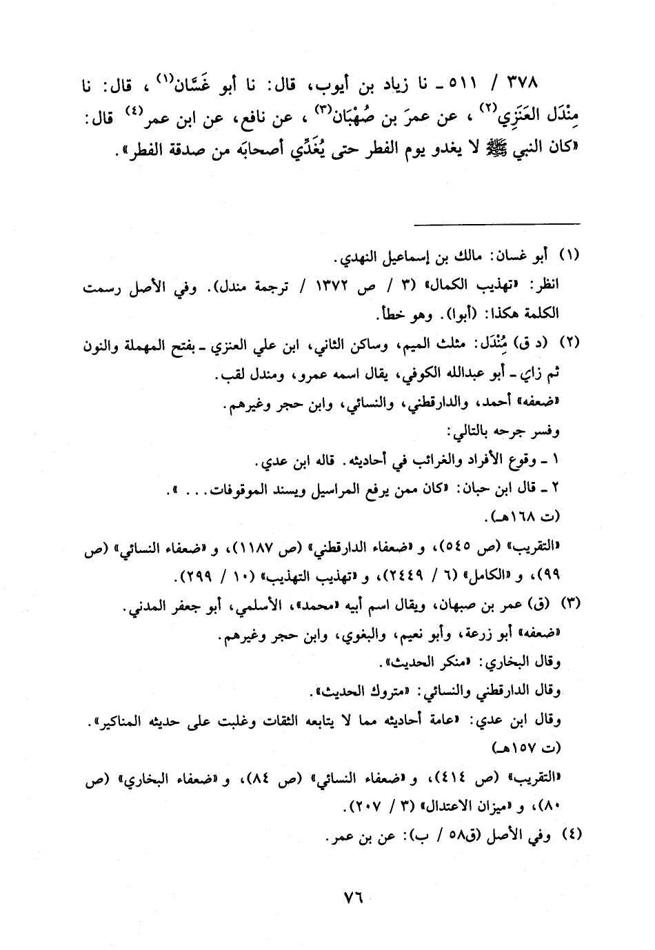 378 - / 511 نَا زِيَادُ بْنُ أَيُّوبَ قَالَ نَا أَبُو غَسَّانَ قَالَ نَا مِنْدَلٌ الْعَنَزِيُّ عَنْ عُمَرَ بْنِ صُهْبَانَ عَنْ نَافِعٍ عَنِ ابْنِ عُمَرَ قَالَ كَانَ النَّبِيُّ صَلَّى اللَّهُ عَلَيْهِ وَسَلَّمَ لَا يَغْدُو يَوْمَ الْفِطْرِ حَتَّى يُغَدِّيَ أَصْحَابَهُ مِنْ صَدَقَةِ الْفِطْرِ