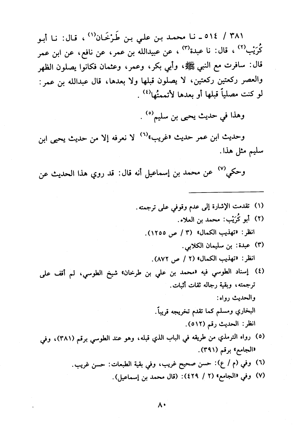 381 - / 514 نَا مُحَمَّدُ بْنُ عَلِيِّ بْنِ طَرْخَانَ قَالَ نَا أَبُو كُرَيْبٍ قَالَ نَا عَبْدَةُ عَنْ عُبَيْدِ اللَّهِ بْنِ عُمَرَ عَنْ نَافِعٍ عَنِ ابْنِ عُمَرَ قَالَ سَافَرْتُ مَعَ النَّبِيِّ صَلَّى اللَّهُ عَلَيْهِ وَسَلَّمَ وَأَبِي بَكْرٍ وَعُمَرَ وَعُثْمَانَ فَكَانُوا يُصَلُّونَ الظُّهْرَ وَالْعَصْرَ رَكْعَتَيْنِ رَكْعَتَيْنِ لَا يُصَلُّونَ قَبْلَهَا وَلا بَعْدَهَا قَالَ عَبْدُ اللَّهِ بن عمر لَو كَانَ مُصَلِّيًا قَبْلَهَا أَوْ بَعْدَهَا لأَتْمَمْتُهَا