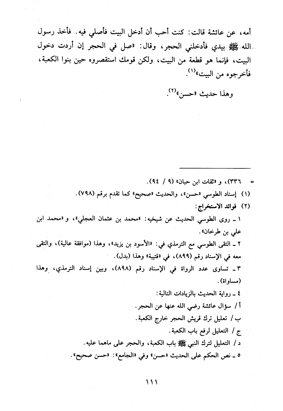 أُمِّهِ عَنْ عَائِشَةَ قَالَتْ كُنْتُ أُحِبُّ أَنْ أَدْخُلَ الْبَيْتَ فَأُصَلِّي فِيهِ فَأَخَذَ رَسُولُ اللَّهِ صَلَّى اللَّهُ عَلَيْهِ وَسَلَّمَ بِيَدِي فَأَدْخَلَنِي الْحِجْرَ وَقَالَ صَلِّ فِي الْحِجْرِ إِنْ أَرَدْتِ دُخُولَ الْبَيْتِ فَإِنَّمَا هُوَ قِطْعَةٌ مِنَ الْبَيْتِ وَلَكِنَّ قَوْمَكِ اسْتَقْصَرُوهُ حِينَ بَنَوُا الْكَعْبَةَ فَأَخْرَجُوهُ مِنَ الْبَيْتِ