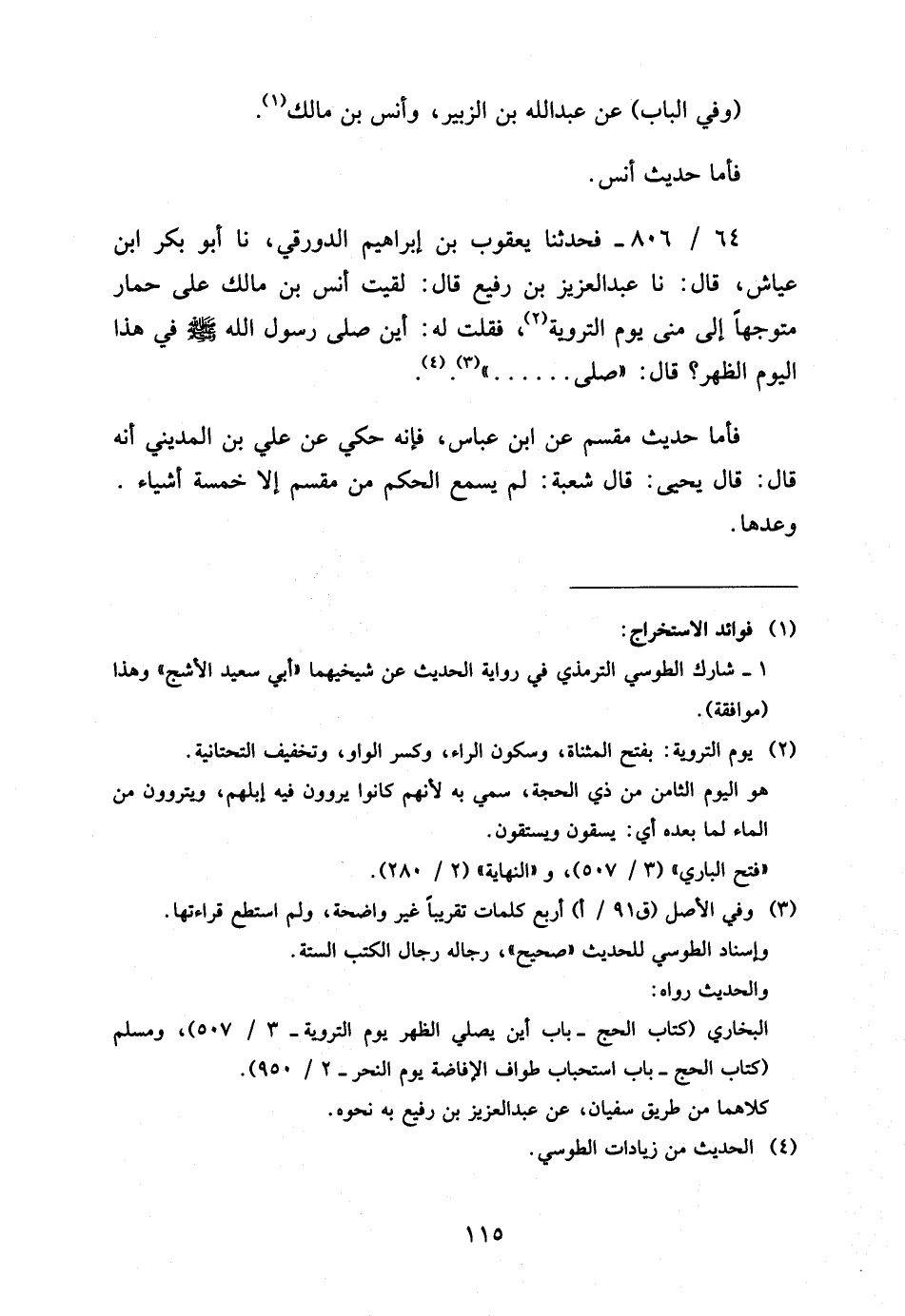 64 - / 806 فَحَدَّثَنَا يَعْقُوبُ بْنُ إِبْرَاهِيمَ الدَّوْرَقِيُّ نَا أَبُو بَكْرِ ابْن عَيَّاشٍ قَالَ نَا عَبْدُ الْعَزِيزِ بْنُ رُفَيْعٍ قَالَ لَقِيتُ أَنَسَ بْنَ مَالِكٍ عَلَى حِمَارٍ مُتَوَجِّهًا إِلَى مِنًى يَوْمَ التَّرْوِيَةِ فَقُلْتُ لَهُ أَيْنَ صَلَّى رَسُولُ اللَّهِ صَلَّى اللَّهُ عَلَيْهِ وَسَلَّمَ فِي هَذَا الْيَوْمِ الظُّهْرَ قَالَ صَلَّى