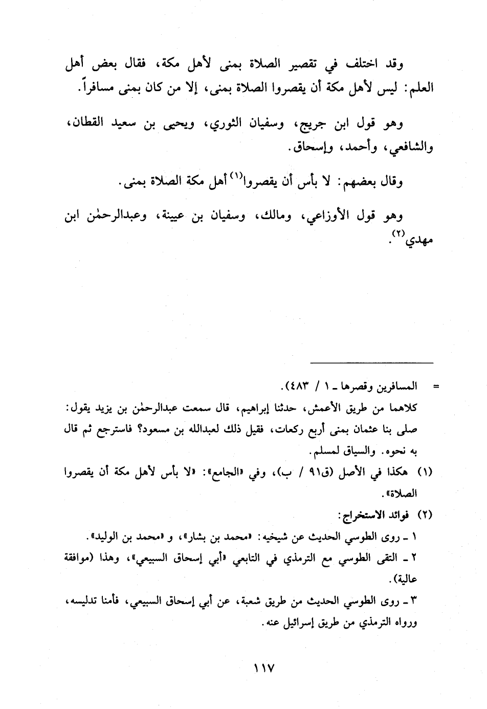 وَقَدِ اخْتُلِفَ فِي تَقْصِيرِ الصَّلاةِ بِمِنًى لأَهْلِ مَكَّةَ فَقَالَ بَعْضُ أَهْلِ الْعِلْمِ لَيْسَ لأَهْلِ مَكَّةَ أَنْ يُقْصِرُوا الصَّلاةَ بِمِنًى إِلا مَنْ كَانَ بِمِنًى مُسَافِرًا