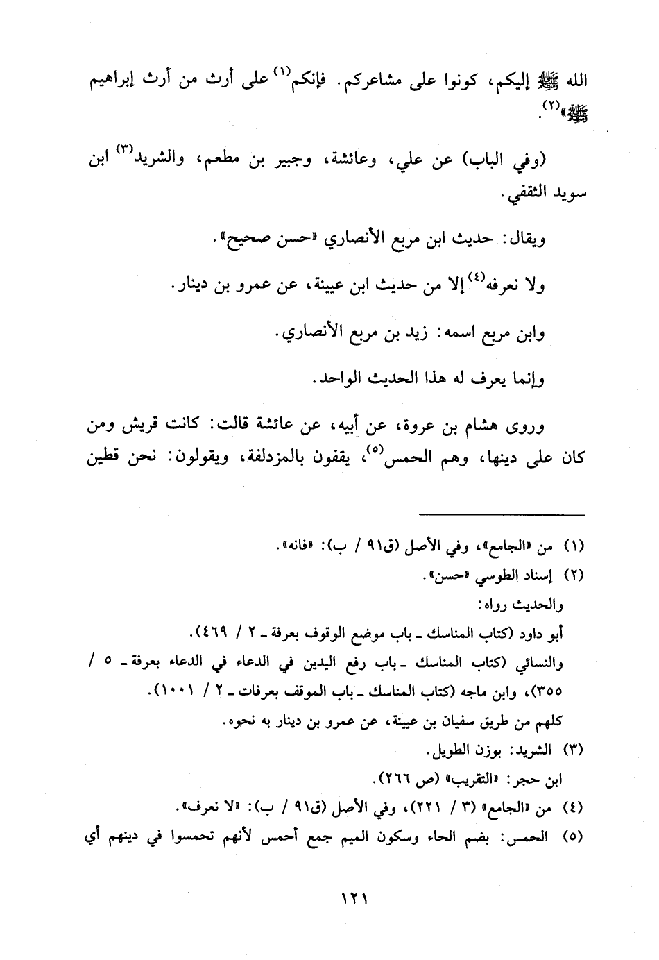 اللَّهِ صَلَّى اللَّهُ عَلَيْهِ وَسَلَّمَ إِلَيْكُمْ كُونُوا عَلَى مَشَاعِرِكُمْ فَإِنَّكُمْ عَلَى إِرْثٍ مِنْ إِرْثِ إِبْرَاهِيمَ صَلَّى اللَّهُ عَلَيْهِ وَسَلَّمَ