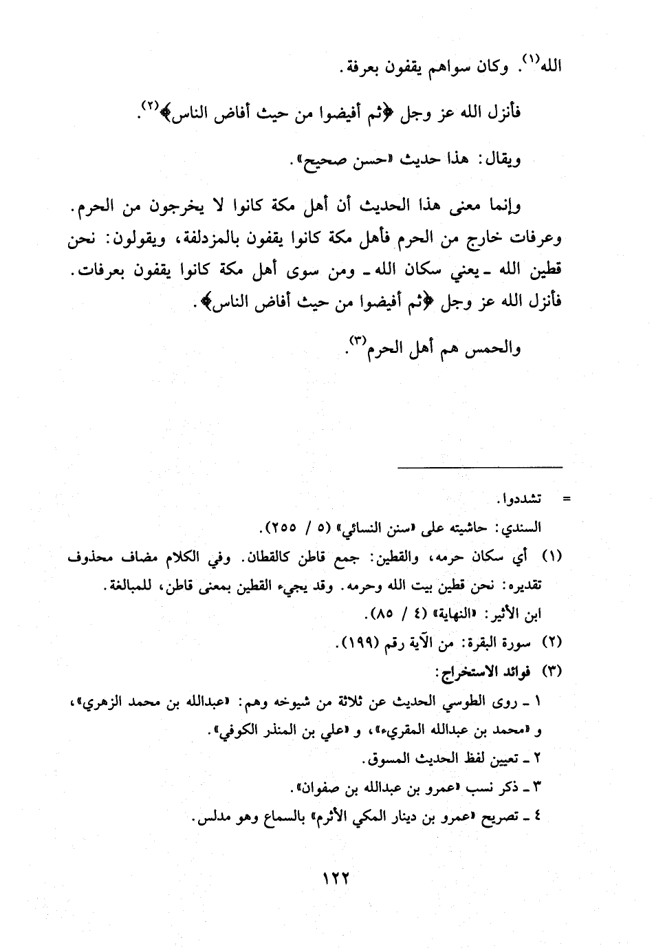 وَإِنَّمَا مَعْنَى هَذَا الْحَدِيثِ أَنَّ أَهْلَ مَكَّةَ كَانُوا لَا يَخْرُجُونَ مِنَ الْحَرَمِ وَعَرَفَاتٌ خَارِجٌ مِنَ الْحَرَمِ فَأَهْلُ مَكَّةَ كَانُوا يَقِفُونَ بِالْمُزْدَلِفَةُ وَيَقُولُونَ نَحْنُ قَطِينُ اللَّهِ يَعْنِي سُكَّانَ اللَّهِ وَمَنْ سِوَى أَهْلِ مَكَّةَ كَانُوا يَقِفُونَ بِعَرَفَاتٍ