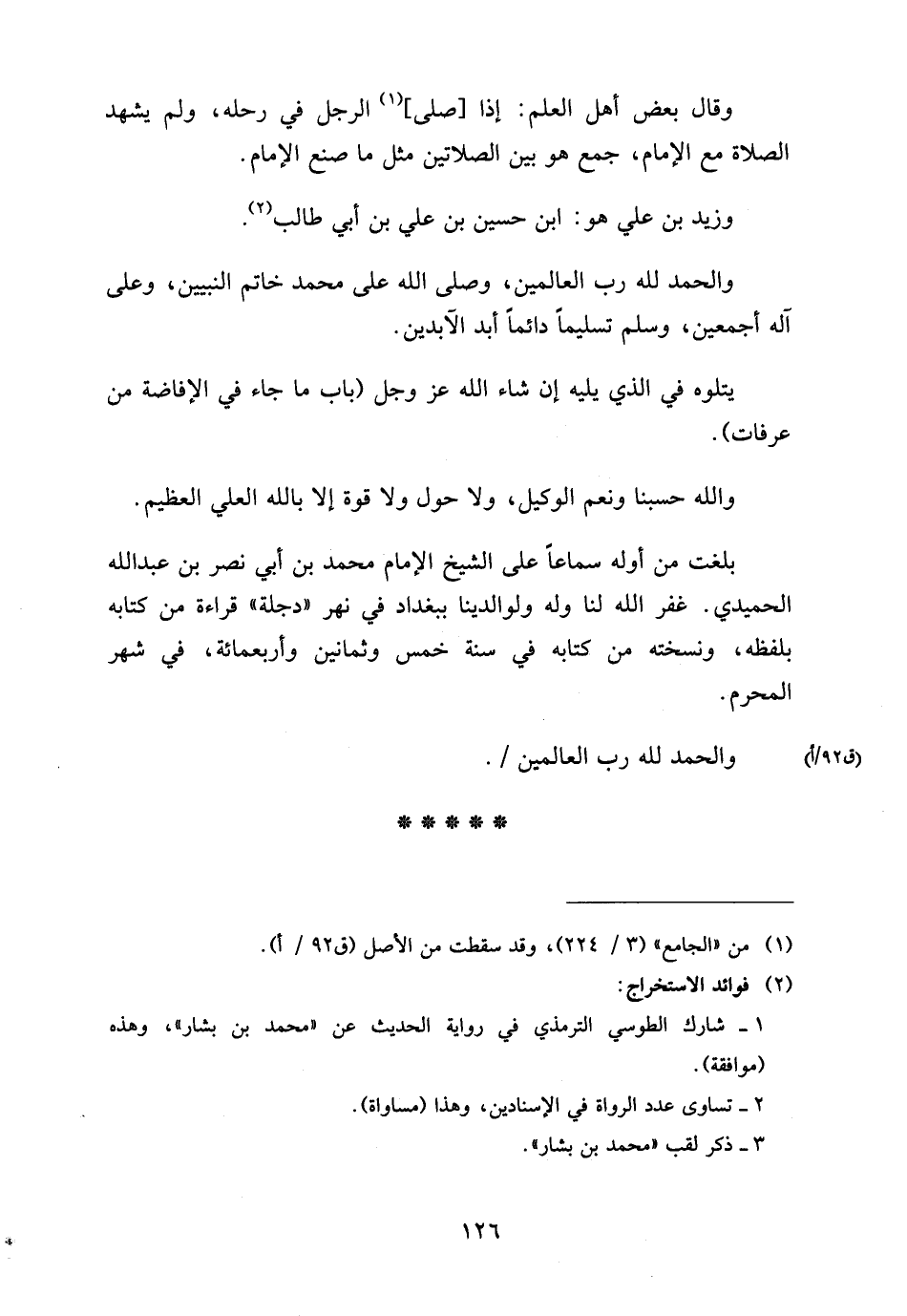 بَلَغْتُ مِنْ أَوَّلِهِ سَمَاعًا عَلَى الشَّيْخُ الإِمَامُ مُحَمَّدُ بْنُ أَبِي نَصْرِ بْنِ عَبْدِ اللَّهِ الْحُمَيْدِيِّ غَفَرَ اللَّهُ لَنَا وَلَهُ وَلِوَالِدَيْنَا بِبَغْدَادَ فِي نَهْرِ دِجْلَةَ قِرَاءَةً مِنْ كِتَابِهِ بِلَفْظِهِ وَنُسْخَتِهِ مِنْ كِتَابِهِ فِي سَنَةِ خمس وَثَمَانِينَ وَأَرْبَعمِائَة فِي شَهْرِ الْمُحَرَّمِ