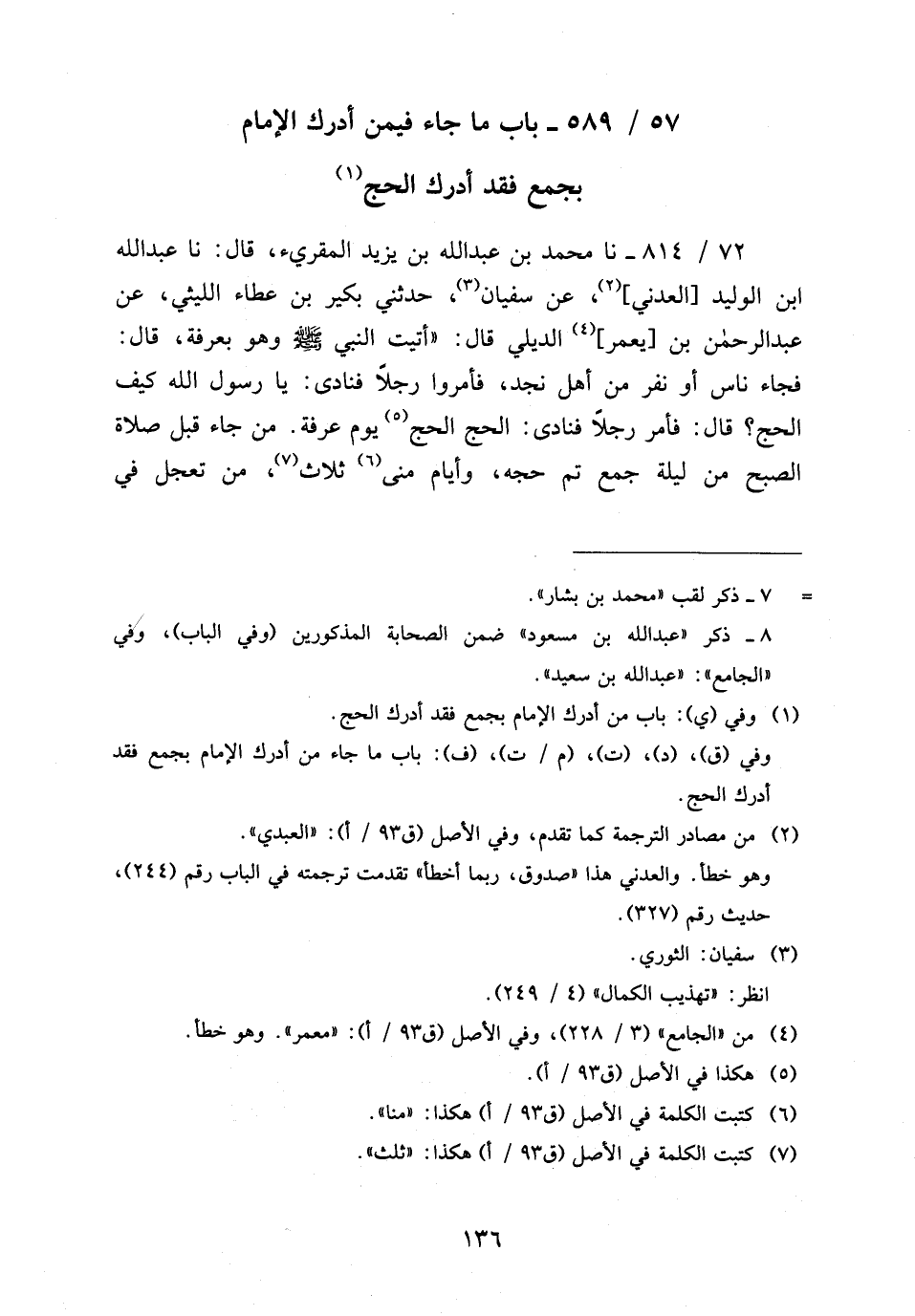57 - / 589 بَابُ مَا جَاءَ فِيمَنْ أَدْرَكَ الإِمَامَ بِجَمْعٍ فَقَدْ أَدْرَكَ الْحَجَّ