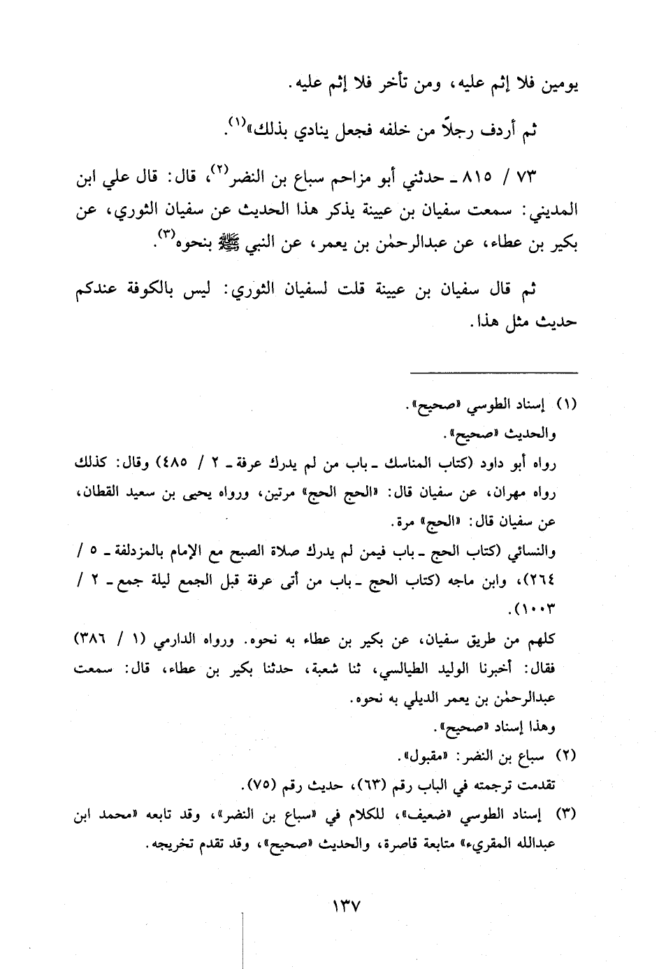 73 - / 815 حَدَّثَنِي أَبُو مُزَاحِمٍ سِبَاعُ بْنُ النَّضْرِ قَالَ قَالَ عَلِيٌّ ابْنُ الْمَدِينِيِّ سَمِعْتُ سُفْيَانَ بْنَ عُيَيْنَةَ يَذْكُرُ هَذَا الْحَدِيثَ عَنْ سُفْيَانَ الثَّوْرِيِّ عَنْ بُكَيْرِ بْنِ عَطَاءٍ عَنْ عَبْدِ الرَّحْمَنِ بْنِ يَعْمُرَ عَنِ النَّبِيِّ صَلَّى اللَّهُ عَلَيْهِ وَسَلَّمَ بِنَحْوِهِ