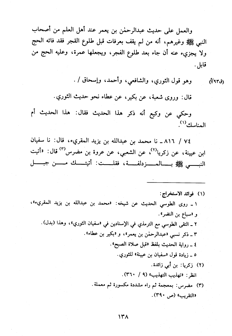 74 - / 816 نَا مُحَمَّدُ بن عبد الله بن يزِيد المقريء قَالَ نَا سُفْيَان ابْن عُيَيْنَةَ عَنْ زَكَرِيَّا عَنِ الشَّعْبِيِّ عَنْ عُرْوَةَ بْنِ مُضَرِّسٍ قَالَ أَتَيْتُ النَّبِيَّ صَلَّى اللَّهُ عَلَيْهِ وَسَلَّمَ بِالْمُزْدَلِفَةِ فَقُلْتُ أَتَيْتُكَ مِنْ جَبَلِ