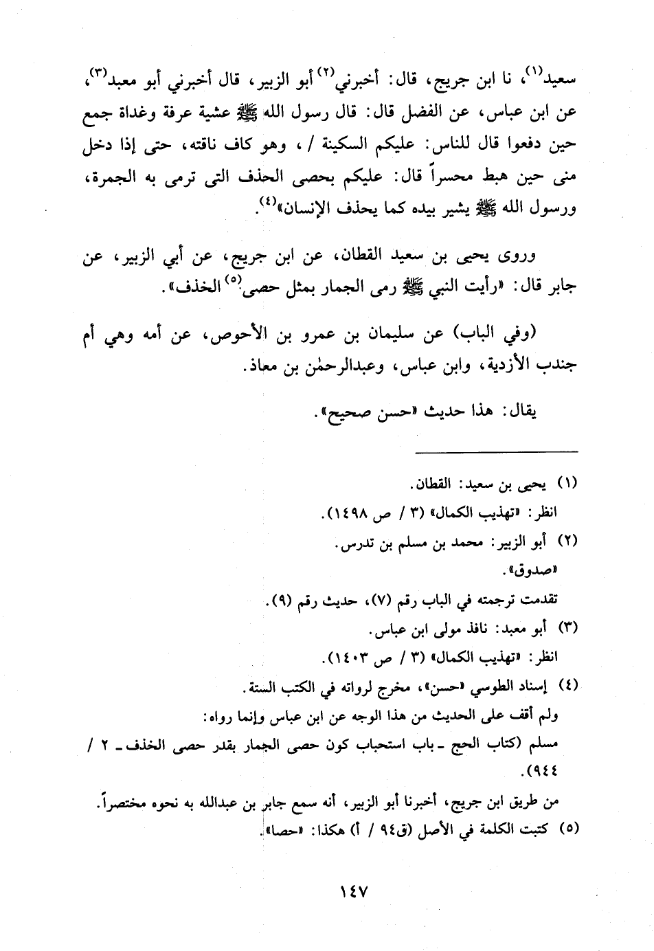 سَعِيدٍ نَا ابْنُ جُرَيْجٍ قَالَ أَخْبَرَنِي أَبُو الزُّبَيْرِ قَالَ أَخْبَرَنِي أَبُو مَعْبَدٍ عَنِ ابْنِ عَبَّاسٍ عَنِ الْفَضْلِ قَالَ قَالَ رَسُولُ اللَّهِ صَلَّى اللَّهُ عَلَيْهِ وَسَلَّمَ عَشِيَّةَ عَرَفَةَ وَغَدَاةَ جمع حِين دفعُوا قَالَ للنَّاس عَلَيْكُم السكينَة وَهُوَ كَافٍّ نَاقَتَهُ حَتَّى إِذَا دَخَلَ مِنًى حِين هَبَط محسرا قَالَ عَلَيْكُم بحصى الْحَذف الَّتِي تُرْمَى بِهِ الْجَمْرَةُ وَرَسُولُ اللَّهِ صَلَّى الله عَلَيْهِ وَسلم يُشِير بِيَدِهِ كَمَا يحذف الإِنْسَانُ