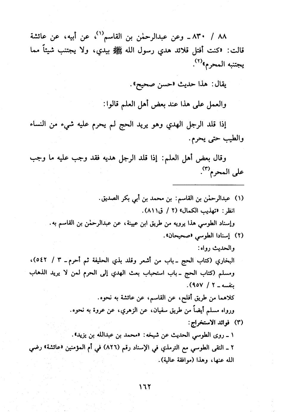88 - / 830 وَعَنْ عَبْدِ الرَّحْمَنِ بْنِ الْقَاسِمِ عَنْ أَبِيهِ عَن عَائِشَة قَالَت كُنْتُ أَفْتِلُ قَلائِدَ هَدْيِ رَسُولِ اللَّهِ صَلَّى اللَّهُ عَلَيْهِ وَسَلَّمَ بِيَدِي وَلا يَجْتَنِبُ شَيْئًا مِمَّا يَجْتَنِبُهُ الْمُحْرِمُ