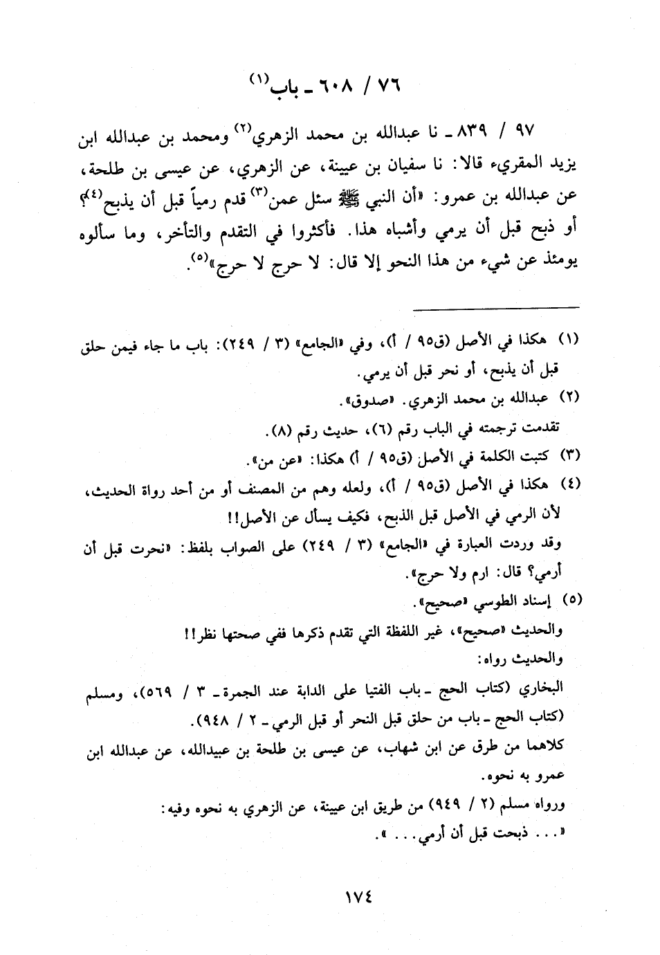 97 - / 839 نَا عَبْدُ اللَّهِ بْنُ مُحَمَّدٍ الزُّهْرِيُّ وَمُحَمّد بن عبد الله ابْن يزِيد المقريء قَالا نَا سُفْيَانُ بْنُ عُيَيْنَةَ عَنِ الزُّهْرِيِّ عَنْ عِيسَى بْنِ طَلْحَةَ عَنْ عَبْدِ اللَّهِ بْنِ عَمْرٍو أَنَّ النَّبِيَّ صَلَّى اللَّهُ عَلَيْهِ وَسَلَّمَ سُئِلَ عَمَّنْ قَدَّمَ رَمْيًا قَبْلَ أَنْ يَذْبَحَ أَوْ ذَبَحَ قَبْلَ أَنْ يَرْمِيَ وَأَشْبَاهَ هَذَا فَأَكْثَرُوا فِي التَّقَدُّمِ وَالتَّأَخُّرِ وَمَا سَأَلُوهُ يَوْمَئِذٍ عَنْ شَيْءٍ مِنْ هَذَا النَّحْوِ إِلا قَالَ لَا حَرَجَ لَا حَرَجَ