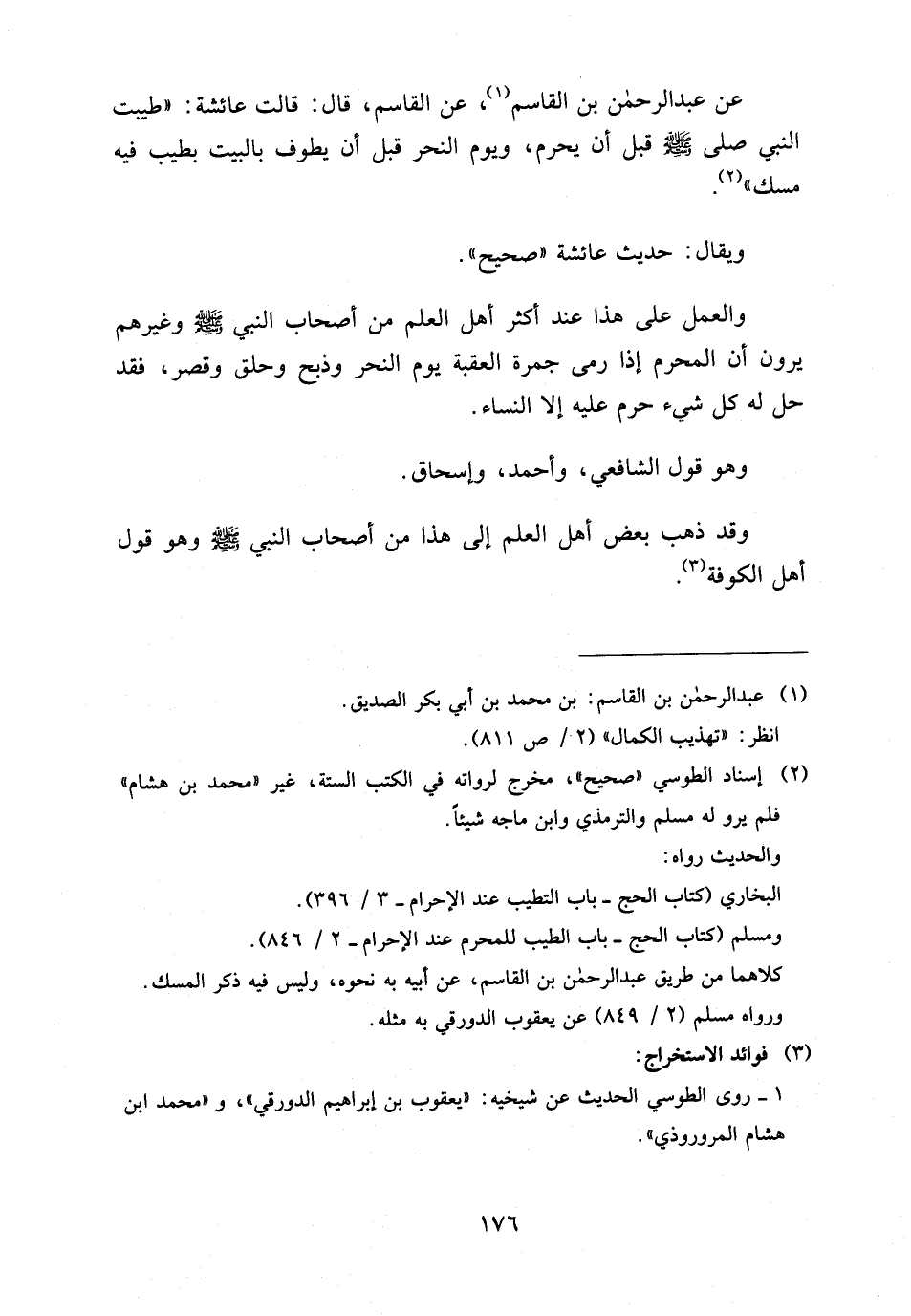 عَنْ عَبْدِ الرَّحْمَنِ بْنِ الْقَاسِمِ عَنِ الْقَاسِمِ قَالَ قَالَت عَائِشَة طيبت النَّبِي صلى صَلَّى اللَّهُ عَلَيْهِ وَسَلَّمَ قَبْلَ أَنْ يُحْرِمَ وَيَوْمَ النَّحْرِ قَبْلَ أَنْ يَطُوفَ بِالْبَيْتِ بِطِيبٍ فِيهِ مِسْكٌ