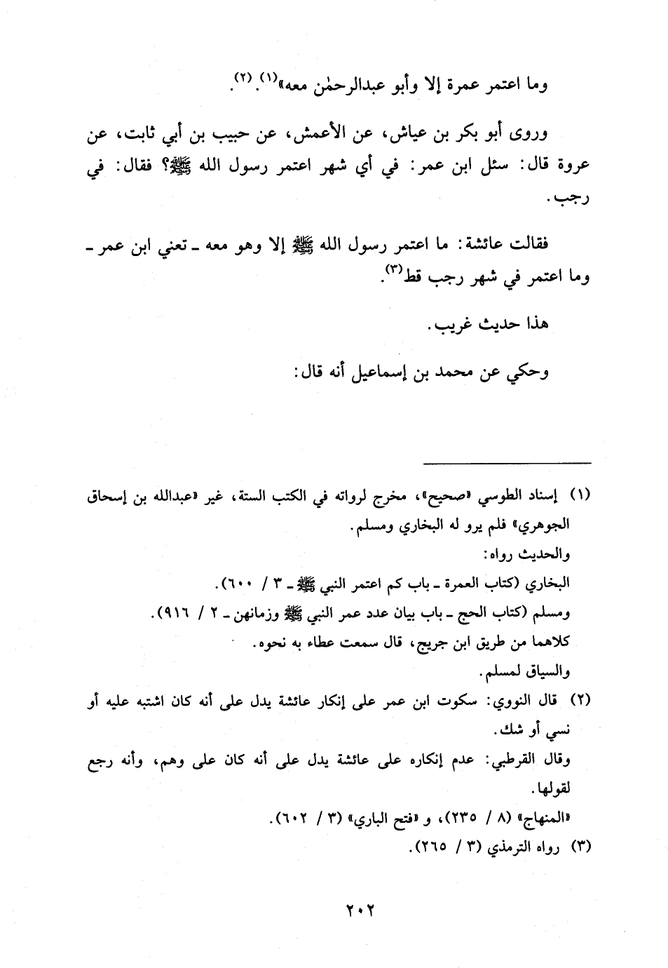 وَرَوَى أَبُو بَكْرِ بْنُ عَيَّاشٍ عَنِ الأَعْمَشِ عَنْ حَبِيبِ بْنِ أَبِي ثَابِتٍ عَنْ عُرْوَةَ قَالَ سُئِلَ ابْنُ عُمَرَ فِي أَيِّ شَهْرٍ اعْتَمَرَ رَسُولُ اللَّهِ صَلَّى اللَّهُ عَلَيْهِ وَسَلَّمَ فَقَالَ فِي رَجَبٍ