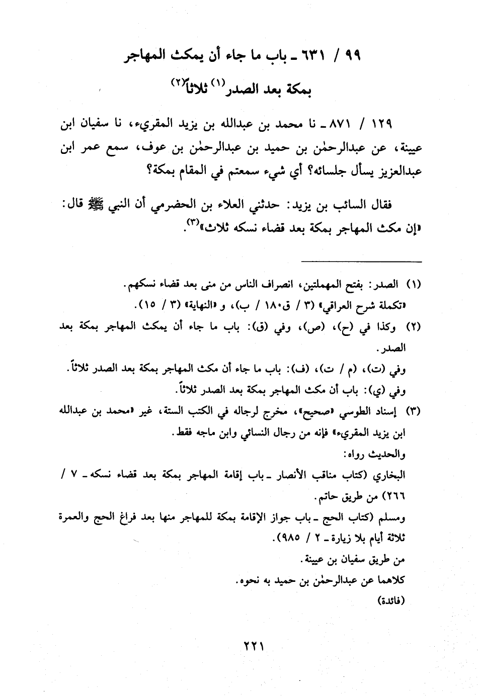 99 - / 631 بَابَ مَا جَاءَ أَنْ يَمْكُثَ الْمُهَاجِرُ بِمَكَّةَ بَعْدَ الصَّدْرِ ثَلاثًا