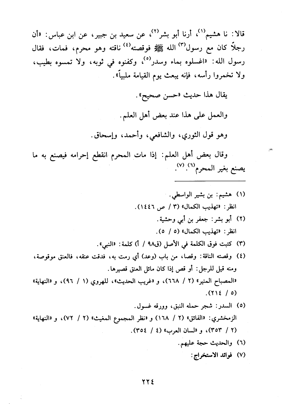 قَالا نَا هُشَيْمٌ أرنا أَبُو بِشْرٍ عَنْ سَعِيدِ بْنِ جُبَيْرٍ عَنِ ابْنِ عَبَّاسٍ أَنَّ رَجُلا كَانَ مَعَ رَسُولِ اللَّهِ صَلَّى اللَّهُ عَلَيْهِ وَسَلَّمَ فَوَقَصَتْهُ نَاقَتُهُ وَهُوَ مُحْرِمٌ فَمَاتَ فَقَالَ رَسُول الله اغْسِلُوهُ بِمَاءٍ وَسِدْرٍ وَكَفِّنُوهُ فِي ثَوْبِهِ وَلا تَمَسُّوهُ بِطِيبٍ وَلا تُخَمِّرُوا رَأْسَهُ فَإِنَّهُ يُبْعَثُ يَوْمَ الْقِيَامَةِ مُلَبِّيًا