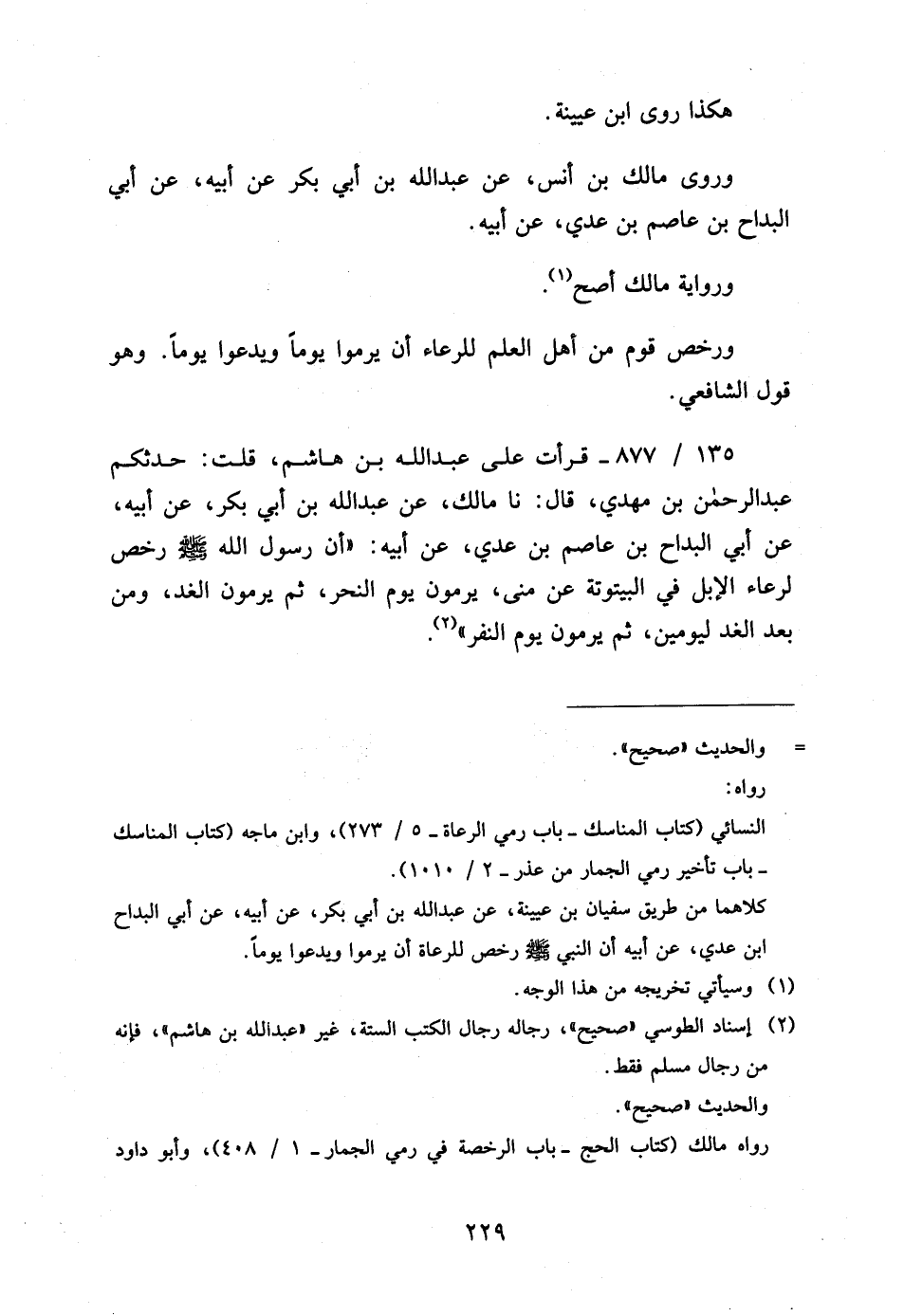 135 - / 877 قَرَأْتُ عَلَى عَبْدِ اللَّهِ بْنِ هَاشِمٍ قُلْتُ حَدَّثَكُمْ عَبْدُ الرَّحْمَنِ بْنُ مَهْدِيٍّ قَالَ نَا مَالِكٌ عَنْ عَبْدِ اللَّهِ بْنِ أَبِي بَكْرٍ عَنْ أَبِيهِ عَنْ أَبِي الْبَدَّاحِ بْنِ عَاصِمِ بْنِ عَدِيٍّ عَنْ أَبِيهِ أَنَّ رَسُولَ اللَّهِ صَلَّى اللَّهُ عَلَيْهِ وَسَلَّمَ رَخَّصَ لِرِعَاءِ الإِبِلِ فِي الْبَيْتُوتَةِ عَنْ مِنًى يَرْمُونَ يَوْمَ النَّحْرِ ثُمَّ يَرْمُونَ الْغَدَ وَمِنْ بَعْدِ الْغَدِ لِيَوْمَيْنِ ثُمَّ يَرْمُونَ يَوْمَ النَّفْرِ