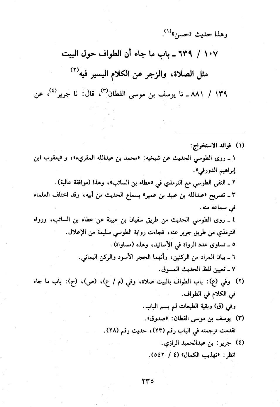 107 - / 639 بَابُ مَا جَاءَ أَنَّ الطَّوَافَ حَوْلَ الْبَيْتِ مِثْلُ الصَّلاةِ وَالزَّجْرَ عَنِ الْكَلامِ الْيَسِيرِ فِيهِ