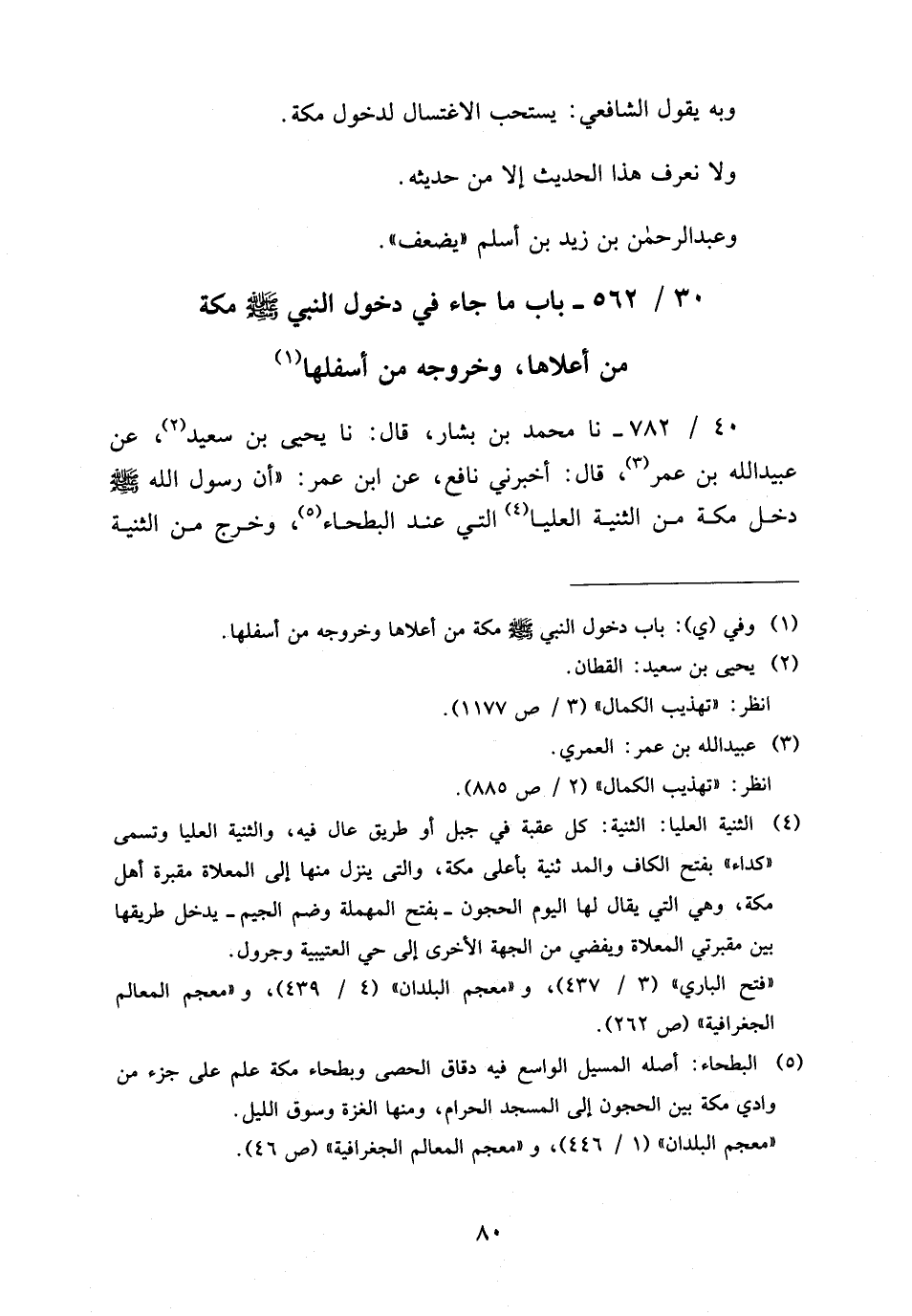 40 - / 782 نَا مُحَمَّدُ بْنُ بَشَّارٍ قَالَ نَا يَحْيَى بْنُ سَعِيدٍ عَنْ عُبَيْدِ اللَّهِ بْنِ عُمَرَ قَالَ أَخْبَرَنِي نَافِعٌ عَنِ ابْنِ عُمَرَ أَنَّ رَسُولَ اللَّهِ صَلَّى اللَّهُ عَلَيْهِ وَسَلَّمَ دَخَلَ مَكَّةَ مِنَ الثَّنِيَّةِ الْعُلْيَا الَّتِي عِنْدَ الْبَطْحَاءِ وَخَرَجَ مِنَ الثَّنِيَّةِ