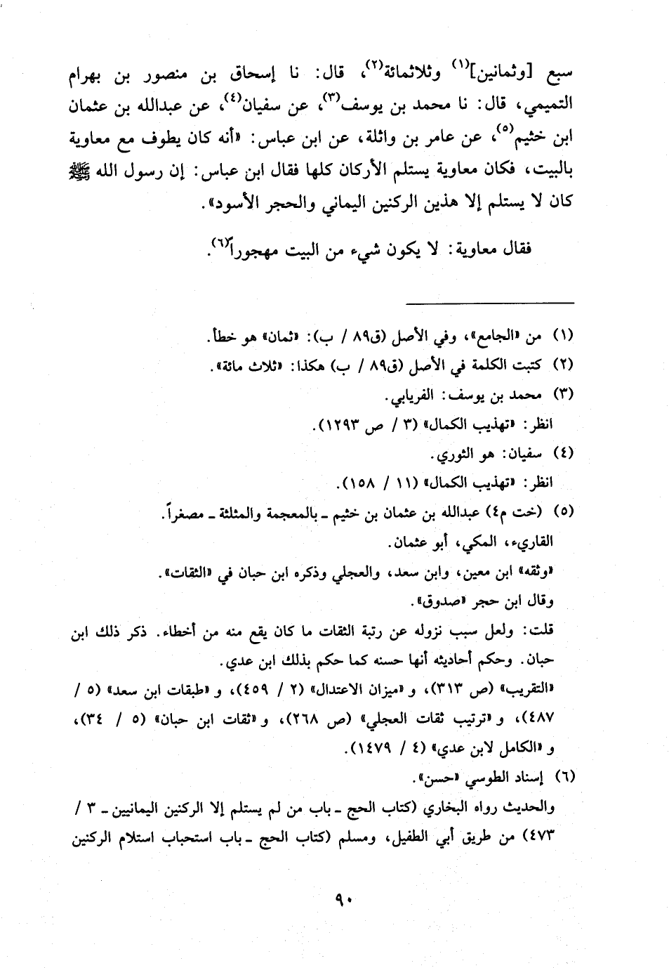 سبع وَثَمَانِينَ وثلاثمائة قَالَ نَا إِسْحَاقُ بْنُ مَنْصُورِ بْنِ بَهْرَامٍ التَّمِيمِيُّ قَالَ نَا مُحَمَّدُ بْنُ يُوسُفَ عَنْ سُفْيَان عَن عبد الله بن عُثْمَان ابْن خثيم عَن عَامر بن وائلة عَنِ ابْنِ عَبَّاسٍ أَنَّهُ كَانَ يَطُوفُ مَعَ مُعَاوِيَةَ بِالْبَيْتِ فَكَانَ مُعَاوِيَةُ يَسْتَلِمُ الأَرْكَانَ كُلَّهَا فَقَالَ ابْنُ عَبَّاسٍ إِنَّ رَسُولَ اللَّهِ صَلَّى اللَّهُ عَلَيْهِ وَسَلَّمَ كَانَ لَا يَسْتَلِمُ إِلا هَذَيْنِ الرُّكْنَيْنِ الْيَمَانِيَّ وَالْحَجَرَ الأَسْوَدَ