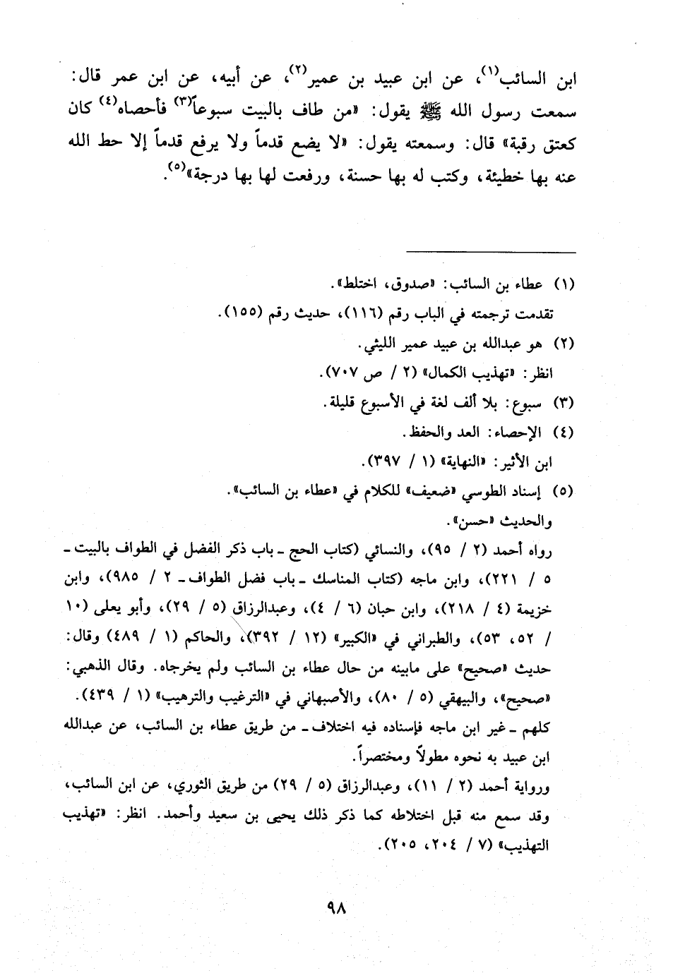 ابْن السَّائِبِ عَنِ ابْنِ عُبَيْدِ بْنِ عُمَيْرٍ عَنْ أَبِيهِ عَنِ ابْنِ عُمَرَ قَالَ سَمِعْتُ رَسُولَ اللَّهِ صَلَّى اللَّهُ عَلَيْهِ وَسَلَّمَ يَقُولُ مَنْ طَاف بِالْبَيْتِ سبوعا فَأَحْصَاهُ كَانَ كَعِتْقِ رَقَبَةٍ قَالَ وَسَمِعْتُهُ يَقُولُ لَا يَضَعُ قَدَمًا وَلا يَرْفَعُ قَدَمًا إِلا حَطَّ اللَّهُ عَنْهُ بِهَا خَطِيئَةً وَكَتَبَ لَهُ بهَا حَسَنَة وَرفعت لَهَا بهَا دَرَجَة