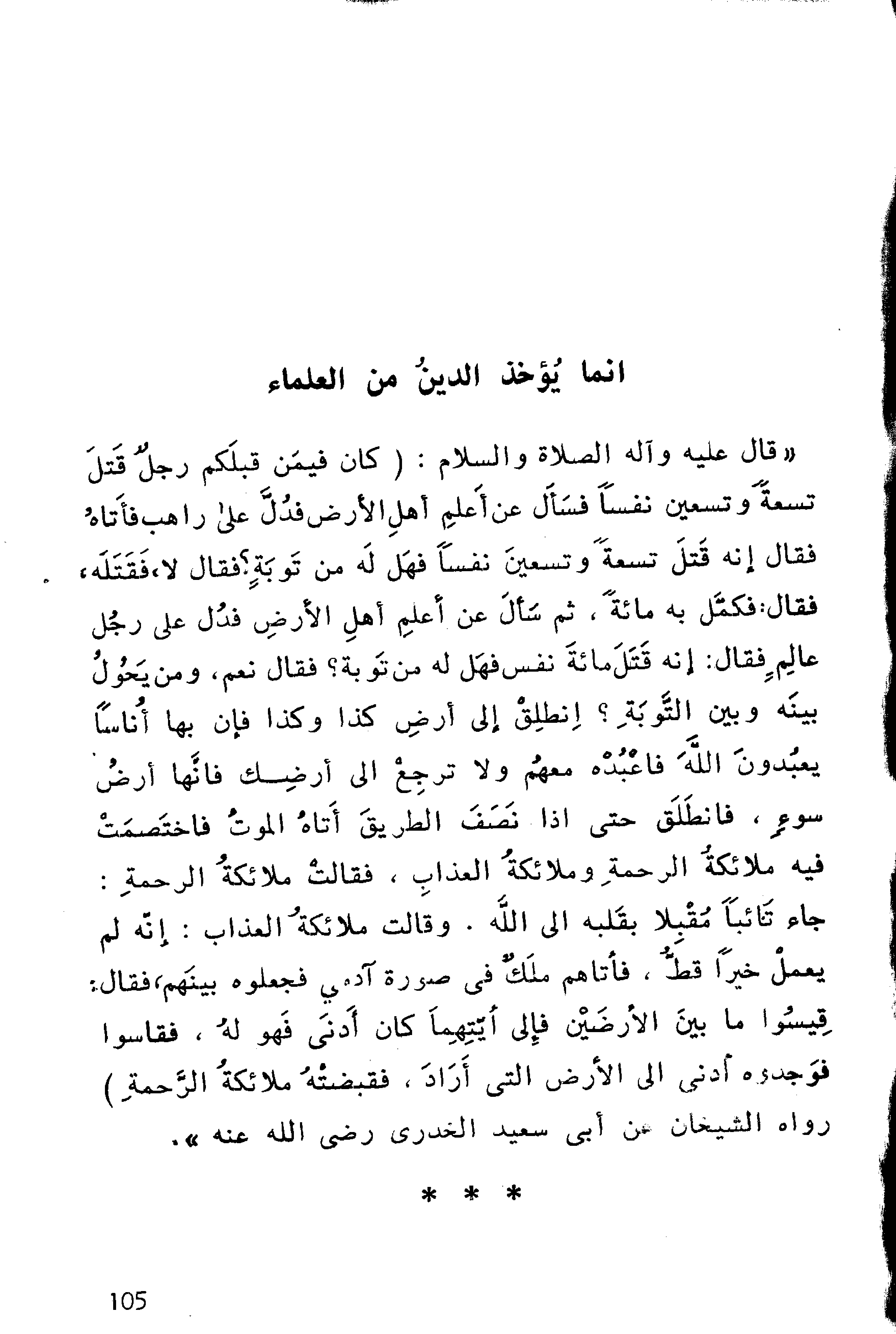 ذلك باليأس والجرأة والاستهانة بقتل النفس. ولكنه بقي مع ذلك يطمع أن يجد عند غيره سبيلا، فدل على عالم فأفتاه بإمكان التوبة مستدلا بأنه لا شيء يحول بينه وبينها، وأشار عليه بمفارقة أرضة التي ضري فيها على الجنايات فإنها كانت أرض سوء عليه، وأمره أن يذهب إلى أخرى بها قوم صالحون يعبدون الله ويسيرون بطاعته فيصاحبهم ويعبد الله معهم لإصلاح نفسه بمعاشرة الصالحين وتحقيق توبته بالعمل الصالح معهم، فذهب الرجل على هذه النية وأدركه الموت قبل أن يصل إلى تلك الأرض، واختصمت فيه ملائكة الرحمة وحجتهم نيته التي خرج عليها، وملائكة العذاب وحجتهم أنه لم يعمل عملا صالحا، فكان القضاء لملائكة الرحمة تغليبا لجانب القصد والنية وتأيدت النية بجده في السير إلى الأرض التي قصد حتى كان أقرب إليها من الأرض التي خرج منها.