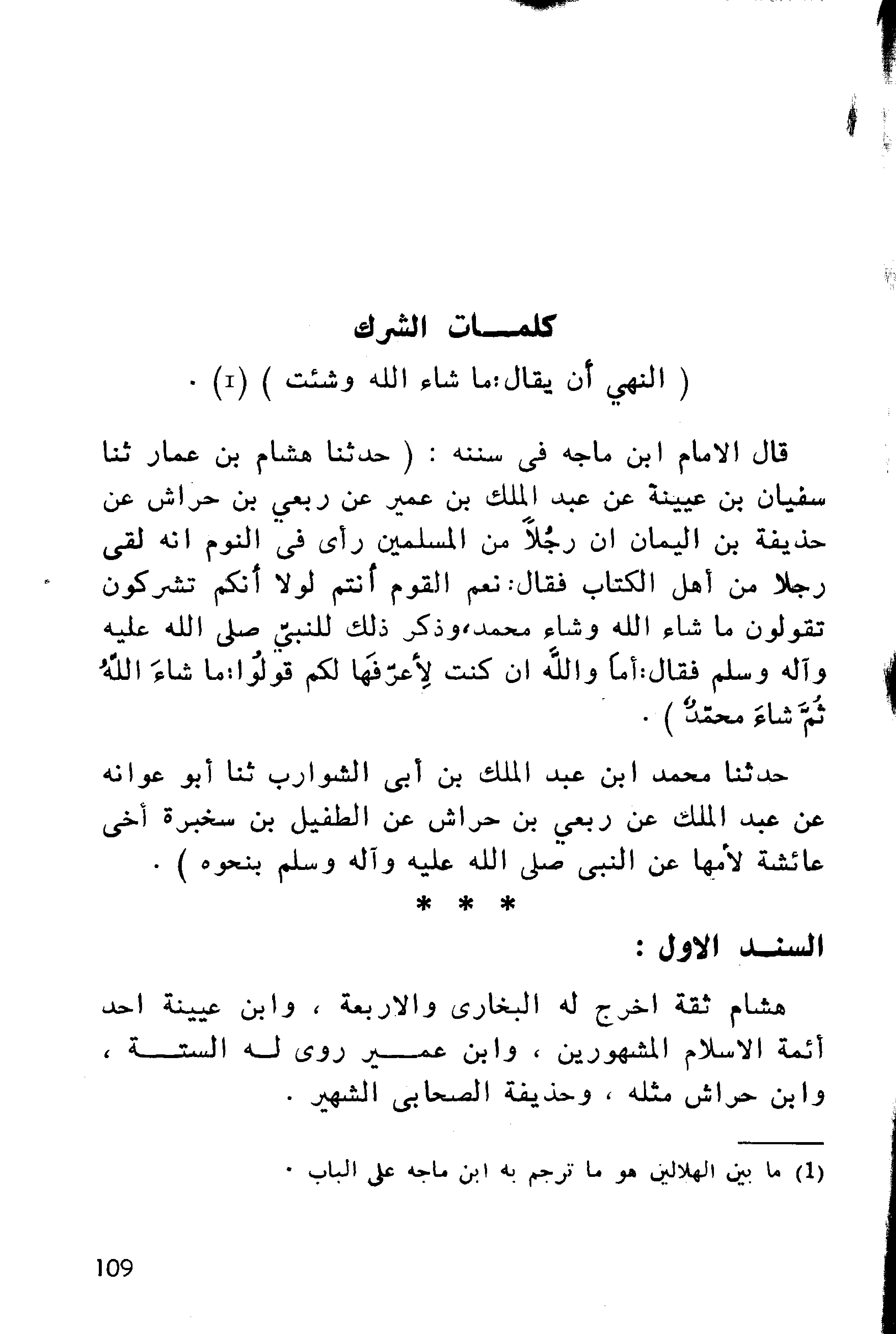 وفي الاستثناء في اليمين نحو إلا ما شاء الله وشاء محمد، وفي باب اليمين أورد الحديث ابن ماجة. إن كنت لأعرفها لكم. ان نافية واللام في لاعرفها لام الجحود والفعل بعدها منصوب فنفى معرفته بهذه العبارة منهم على وجه يفيد أنها شيء ما كان ليخطر في باله لمنافاته لإيمانهم وتوحيدهم وعدم مناسبتها لحالهم. ثم: تفيد انحطاط مشيئة المخلوق عن مشيئة الخالق وتأخرها وتلك هي رتبتها وقد شاء الله ما شاء وحده ثم كانت مشيئة المخلوق، فلفظة وحده أصرح في استقلال مشيئة الله.