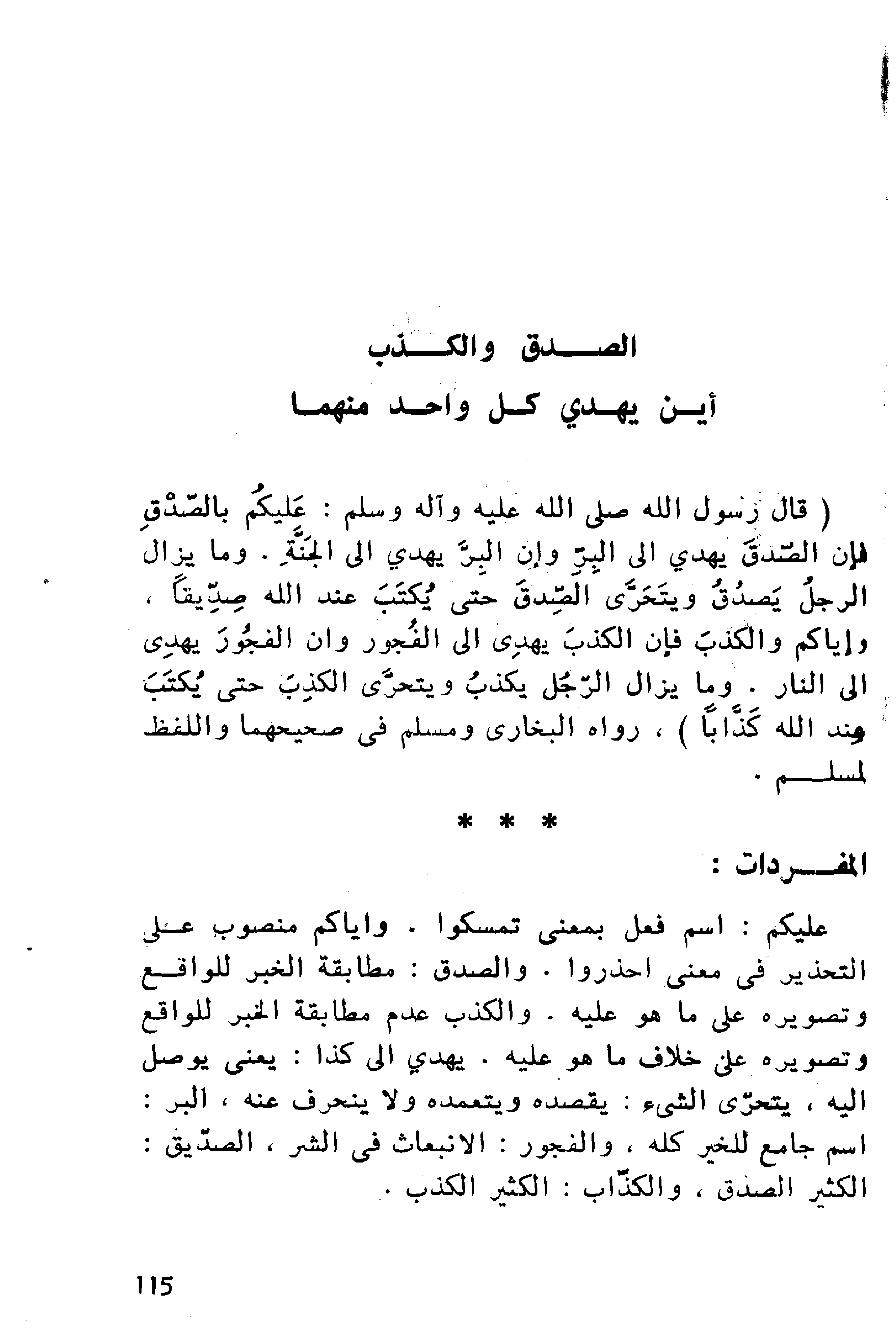 كان الصدق يوصل إلى البر والكذب يوصل إلى الفجور لوجوه، الأول: ما بيناه في الفصل السابق من الارتباط بين أقسام كل منهما ورجوعهما إلى أصل واحد. الثاني: أن إلتزام الصدق يحمل على الوفاء بالعقود والعهود والوعود في معاملة الناس فتجري أعمال المرء مع غيره على سداد واستقامة، والكذب بضد ذلك. الثالث: أن الملتزم للصدق يمسك نفسه عن أعمال السوء مخافة أن يسئل عنها فيصدق فيجر على نفسه سوءا أو يكذب وهو لا يرضى مواقعة الكذب فتجري أعماله على البر سالمة من الفجور، والملتزم للكذب الضاري عليه يرتكب العظائم ولا يبالي أن ينفي عن نفسه كاذبا. أما البر فوصل إلى الجنة لأنها دار المتقين، وأما الفجور فوصل إلى النار لأنها دار الفاسقين، وأما كتابة الملازم للصدق صدّيقا فجزاء له من جنس عمله، فإنه داوم على الصدق وثبت عليه حتى رسخ فيه وتمكن خلقا من أخلاقه فأثبت اسمه كذلك في الصديقين، ومثاله ملازم الكذب.