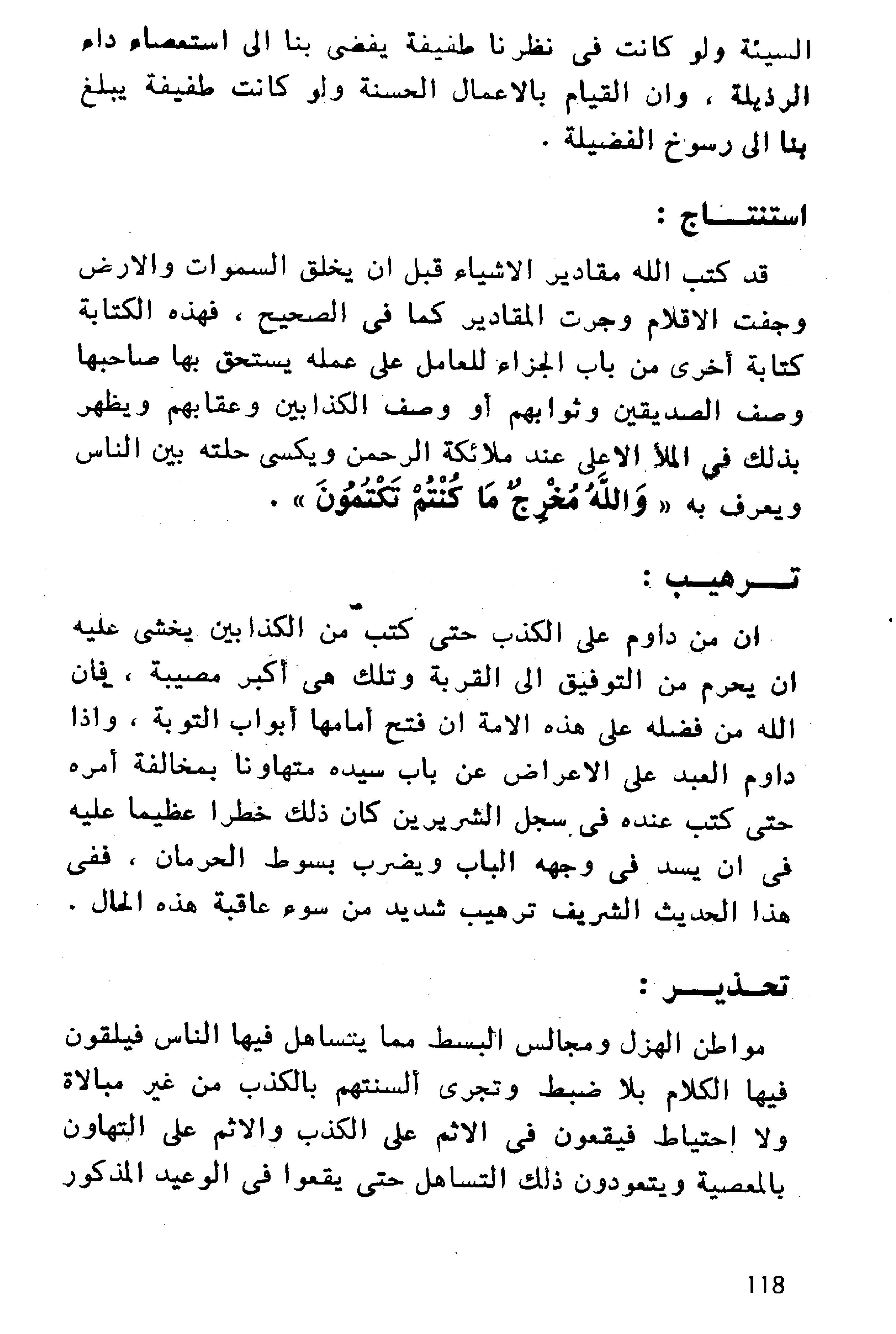 والعلم، وأن يتحرى الصدق وتصوير الحقائق وأن يجعل ذلك من همه وأعظم قصده، وأن يبادر بالتوبة فيما يزل به لسانه إلى ربه، ويعمل دائما على أن يطابق بين عقدهِ بقلبه ونطقه بلسانه وعمله بجوارحه حتى يكون متحريا للصدق بجميع أقسامه ويكتب به بفضل الله ورحمته في الصديقين. وفقنا لهذا ويسرنا له نحن والمسلمين أجمعين يا رب العالمين يا أرحم الراحمين (1)