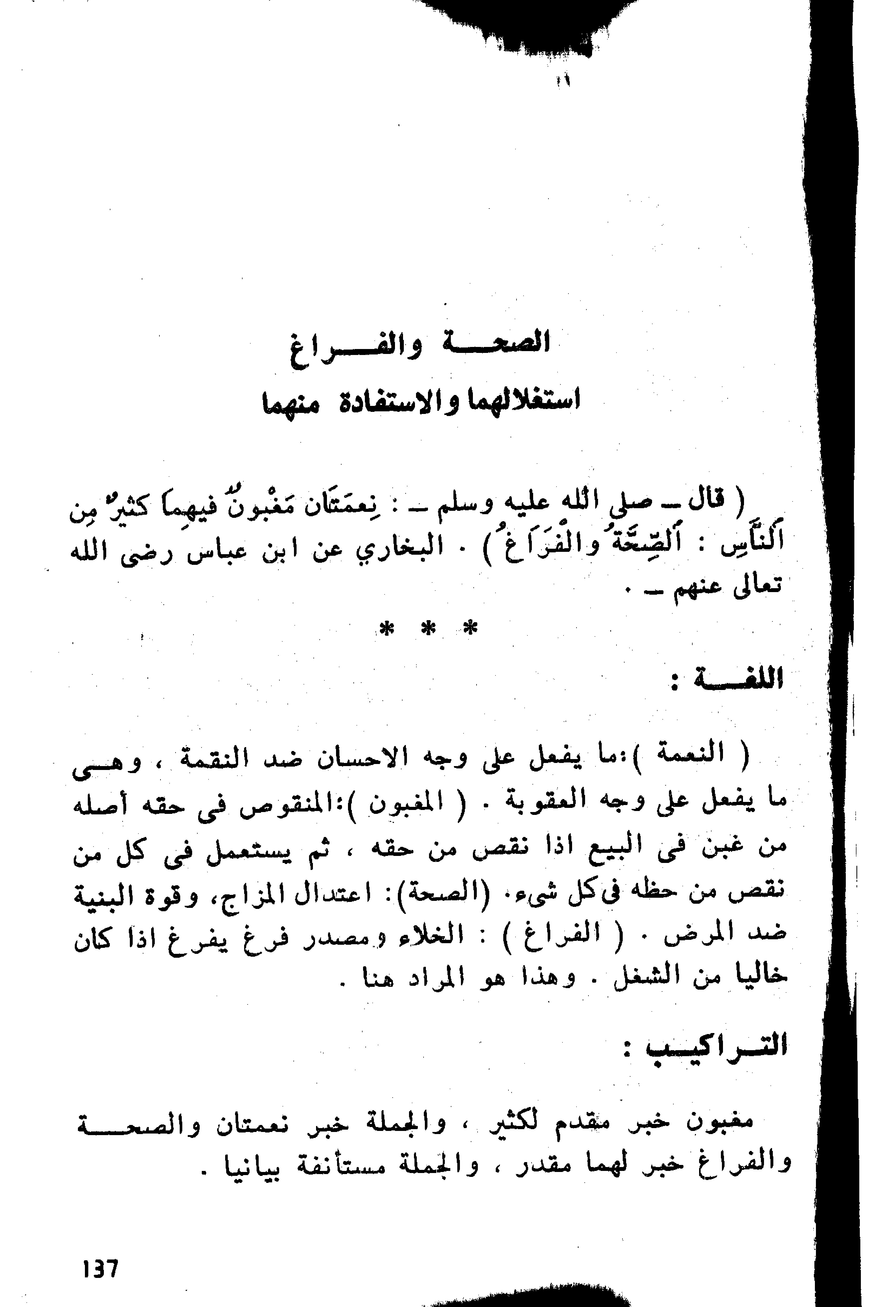 فإذا عمر الإنسان وقت فراغه من الكد لعيشه، بطاعة من طاعات الله واستعمل بدنه مغتنما فرصة صحته فيها، ثم عرض شغل من اشغال عيشه فقطعه عنها، او طرأ عليه مرض فمنعه منها ونيته المداومة على تلك الطاعة لولا الشاغل والمانع، فإنه يكتب له في شغله وفي مرضه، ثواب ما كان يعمله في صحته وفراغه، ومن الدليل على ذلك حديث البخاري -رضي الله عنه- عن أبي بردة بن أبي موسى الأشعري -رضي الله عنهم- سمعت أبا موسى مرارا يقول: قال رسول الله- صلى الله عليه وآله وسلم-: «إذا مرض العبد أو سافر كتب له مثل ما كان يعمل مقيما صحيحا، والسفر نوع من الشغل».