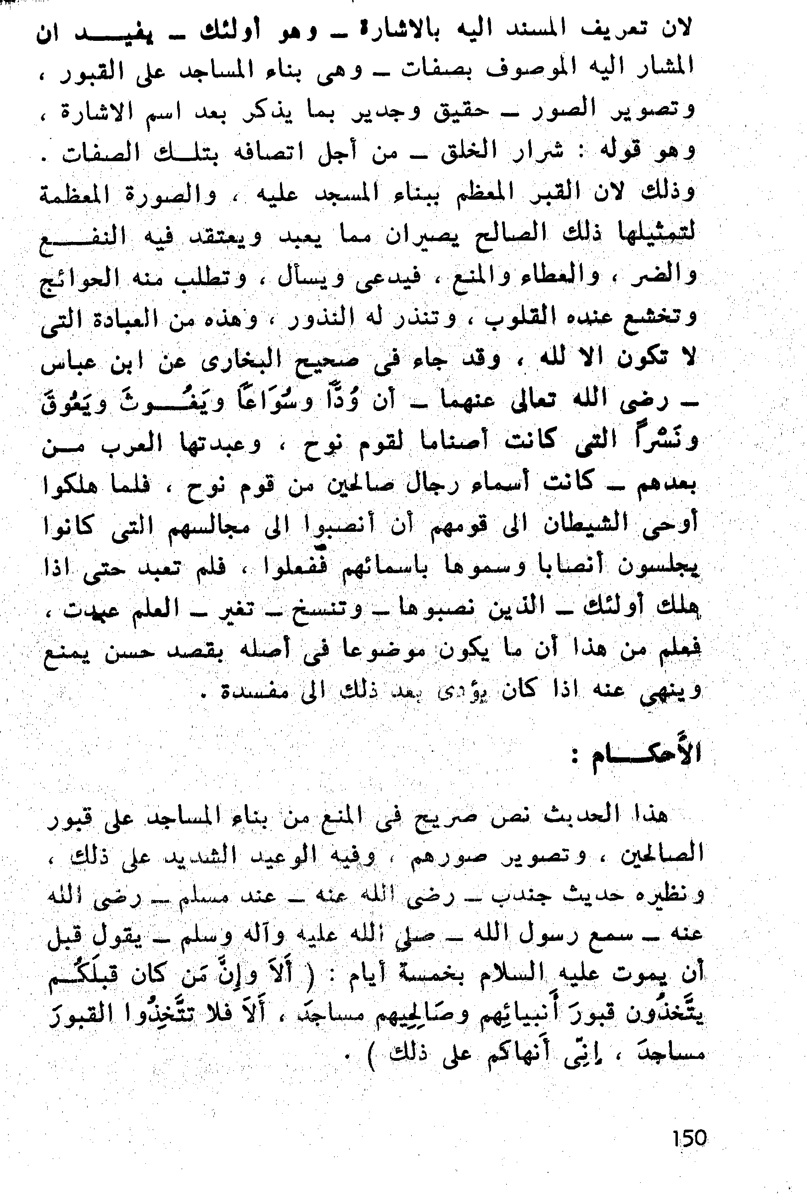 نطق به هذا الحديث الشريف، وأن نبني عليه أعمالنا، فلا نبني مسجداً على قبور ولا نعين عليه، وأن ننكره كما ننكر سائر المنكرات حسب جهدنا، ومن أعظم الإنكار تبليغ هذا الحديث بنصه، وتذكير الناس به، والعمل على نشره حتى يصير معروفا عند عامة الناس وخاصتهم، إذ لا دواء للبدع الشيطانية إلا نشر السنة النبوية، ولا نستعظم انتشار هذه البدعة وكثرة ناصريها فإنها ما انتشرت وكثر أهلها إلا بالسكوت عن مثل هذا الحديث والجهل به. ولنكن في إرشادنا مقتصرين على إيراد لفط الحديث وشرحه -على أنه واضح مفهوم بنفسه- دون أن نمس شيئا من شؤون أولئك المقبورين، فإنهم إخواننا سبقونا بالإيمان، فلهم علينا حق الدعاء والاستغفار، فإذا عملنا كلنا على هذا من حسن قصد ومحبة في الخير للمسلمين، رجونا أن يؤيدنا الله تعالى، ويجعل النفع بأيدينا، {وَلَيَنْصُرَنَّ اللَّهُ مَنْ يَنْصُرُهُ إِنَّ اللَّهَ لَقَوِيٌّ عَزِيزٌ} (1).