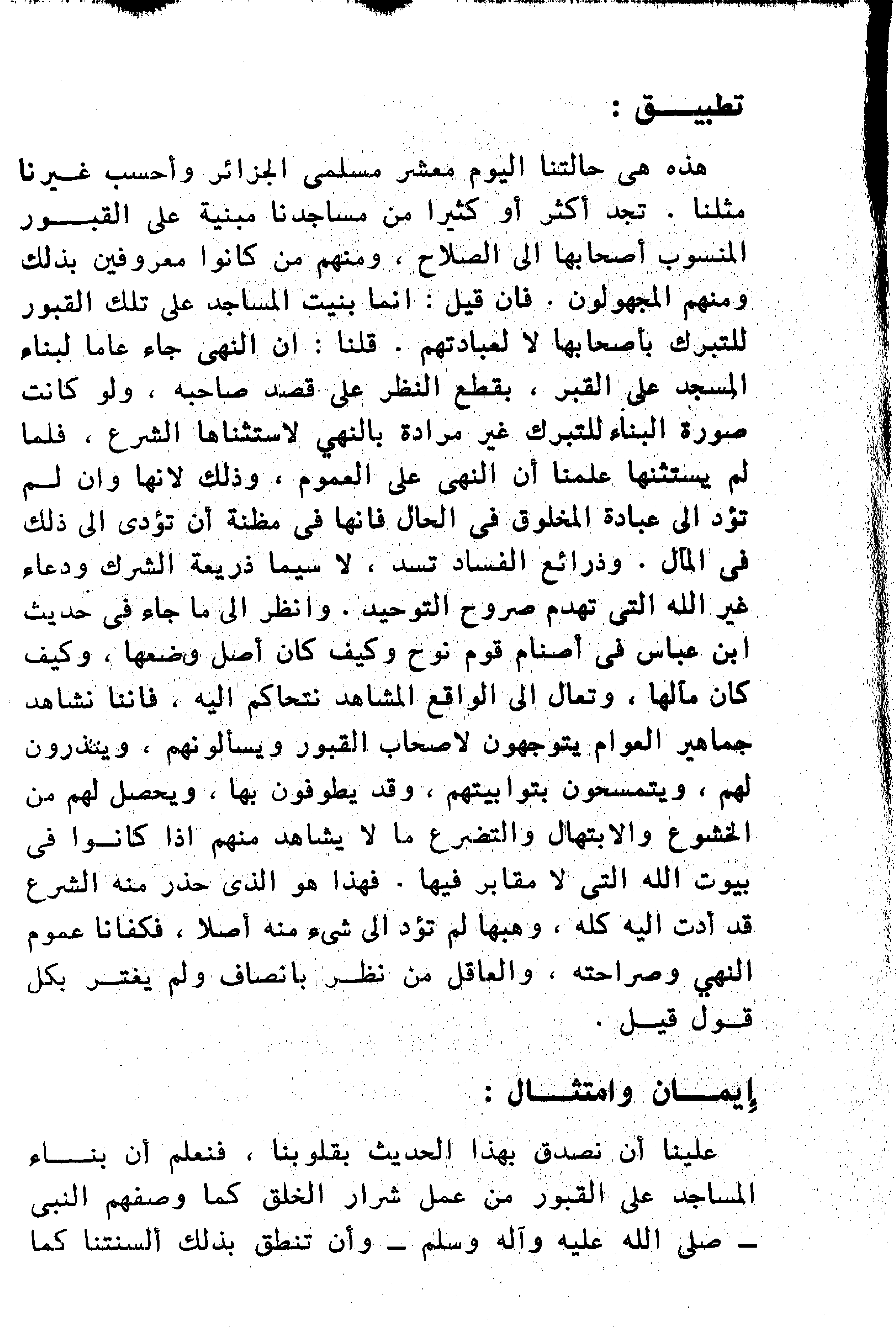 فيا أيها المؤمنون بمحمد- صلى الله عليه وآله وسلم- المصدقون لحديثه، إياكم والبناء على القبور، إياكم واتخاذ المساجد عليها إن كنتم مؤمنين، وعليكم بتبليغ هذا الحديث والتذكير به والتكرير لذكره يكن لكم أجر المجاهدين في سبيل رب العالمين، وثواب العاملين لإحياء سنة سيد المرسلين، عليه وعليهم الصلاة والسلام أجمعين (1).