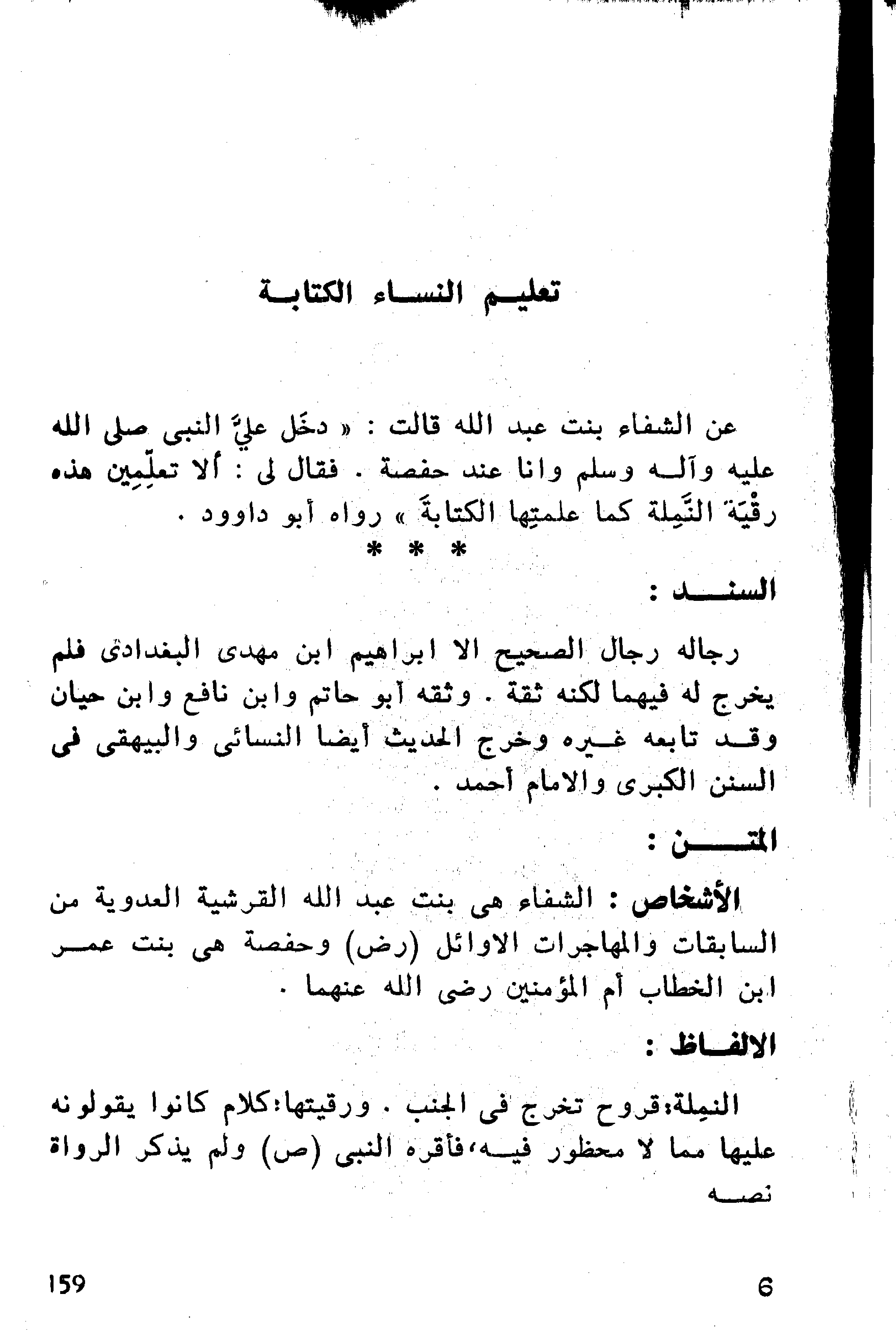 وتأمل قوله تعالى: {وَلْيَكْتُبْ بَيْنَكُمْ كَاتِبٌ بِالْعَدْلِ} وقوله تعالى: {وَاسْتَشْهِدُوا شَهِيدَيْنِ مِنْ رِجَالِكُمْ فَإِنْ لَمْ يَكُونَا رَجُلَيْنِ فَرَجُلٌ وَامْرَأَتَانِ مِمَّنْ تَرْضَوْنَ مِنَ الشُّهَدَاءِ} كيف نص في الثانية على الرجال لما كان الحال مقتضيا لهم وأطلق في الأولى فدل على أنه لا فرق بين أن يكون الكاتب رجلا أو امرأة وهو من أدلته مشروعية تعلم النساء الكتابة. وكل آية دعت للعلم، قد دعت للكتابة لأن الله قد بين لنا أنه علم بالقلم ليبين لنا أن القلم هو طريق العلم وآلة حفظه وتدوينه، وأقسم بالقلم تنويها بشأنه وجاء ذلك كله على الخطاب العام الشامل للنساء شموله للرجال، والعمومات إذا تكاثرت أفادت القطع ولهذا جعلنا هذا الطريق من الاستدلال أقوى من الاستدلال بالحديث الذي هو خبر آحاد وخبر الآحاد- من حيث ذاته- يفيد الظن وإن كان صحيحا. وحيث تواردت تلك العمومات وثبت هذا الحديث فقد بلغ الدليل بنصه وقطعيته غاية القوة والبيان.