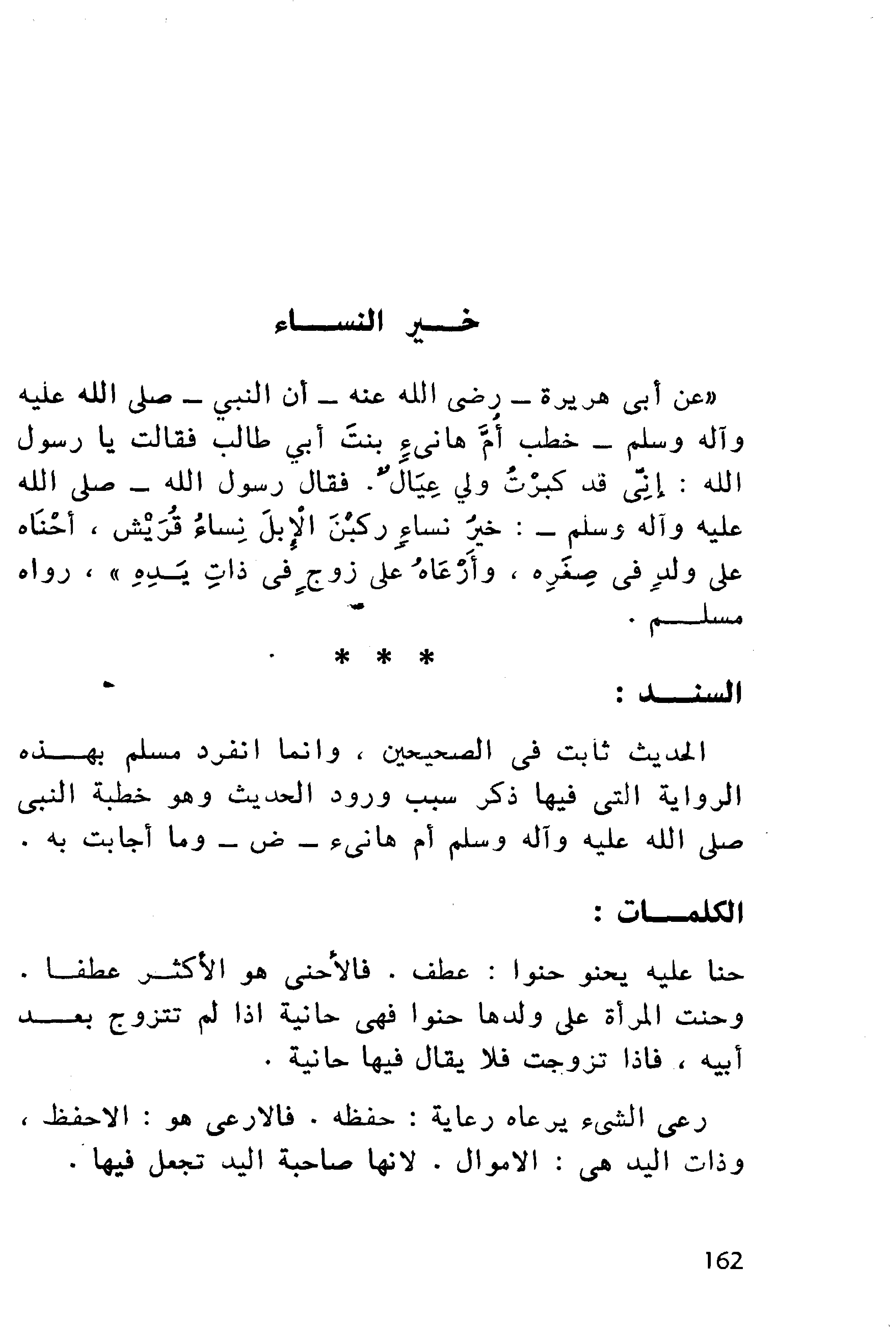 امتنعت أم هانيء من التزوج للقيام بأولادها، فأقرها النبي- صلى الله عليه وآله وسلم- وأثنى على المتصفات به، فدل ذلك على استحسانه لمن ملكت عفتها وقدرت عليه. وثناء النبي- صلى الله عليه وآله وسلم- على نساء قريش بوصفهن دليل على ما ينبغي من اختيار المرأة المتصفة بمثل هذا الوصف، ودليل ما ينبغي أن يتخير من معادن النساء في بيوتهن وأقوامهن فإن الأخلاق تتوارث، والبنات متأثرات بالأمهات في الغالب.