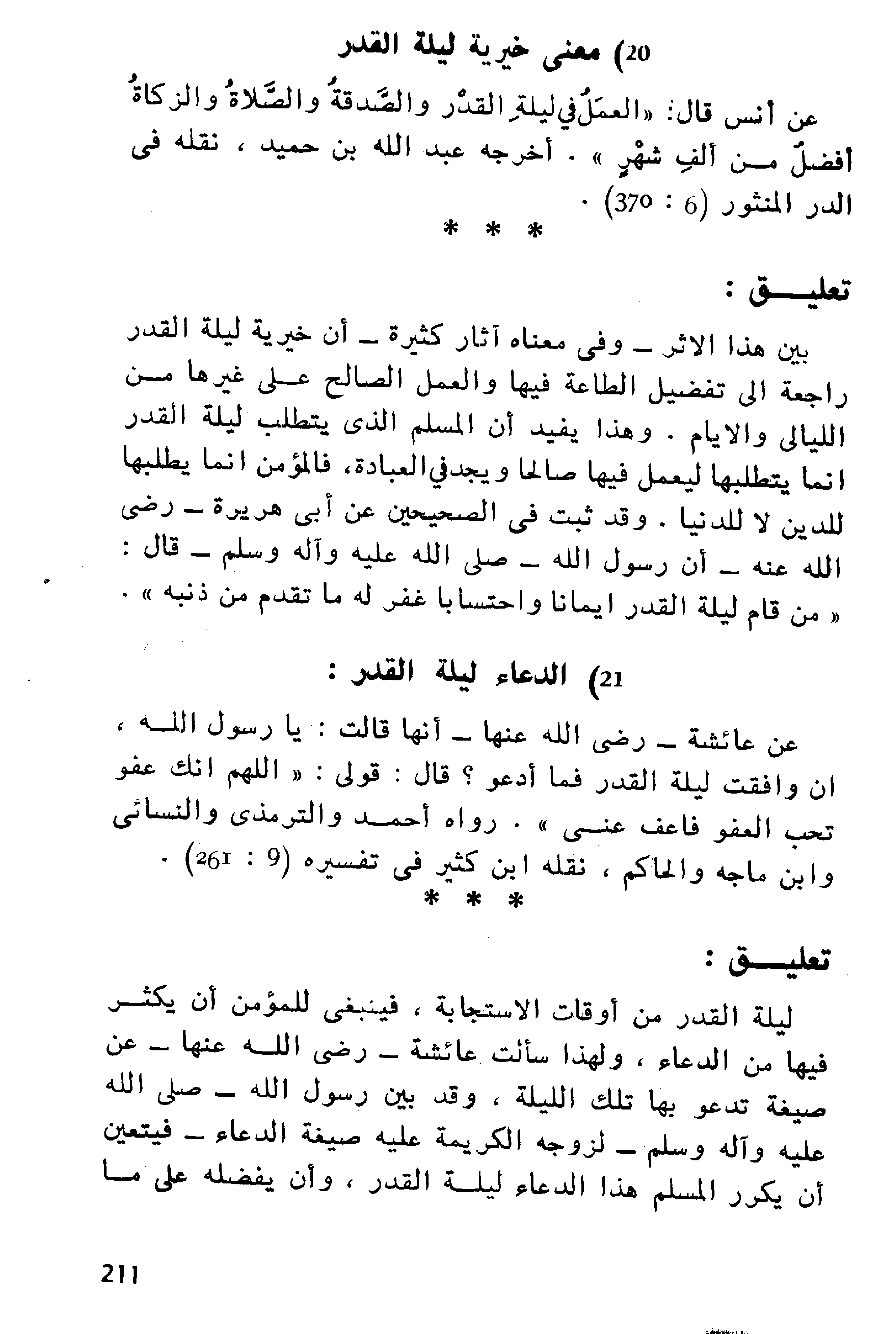 الأحاديث في تعيين ليلة القدر كثيرة متضاربة، والصحيح أنها في رمضان. والراجح أنها في العشر الأواخر منه. وهذه العلامات التي ذكرها الرسول- صلى الله عليه وآله وسلم- ليلة القدر ليس فيها أن السماء تنشق وأنه ظهر فيها ألوان من نور، كل نور له لون خاص، إلى غير ذلك من خرافات العوام. وأن مما يؤسف المؤمن أن الأوقات المفضلة في ديننا قد غمرناها بالخرافات، وصرفنا أنفسنا عما يراد فيها من الطاعات، فحرمنا من خير كثير، وقلما تجد وليا صالحا، أو وقتا فاضلا، إلا وهو محاط بخرافات تعين إبليس على إبراز قسمه في الإغراء، وتقف حجر عثرة أمام الداعي المرشد إلى الصراط المستقيم. وأن مما يؤسف المؤمن أن هذا الشهر، شهر رمضان الذي جمع الله لنا فيه بين الصيام والقيام، وأودع فيه أفضل ليال العام يقطعه أكثرنا في اللهو والقمار، والنوم والشجار.