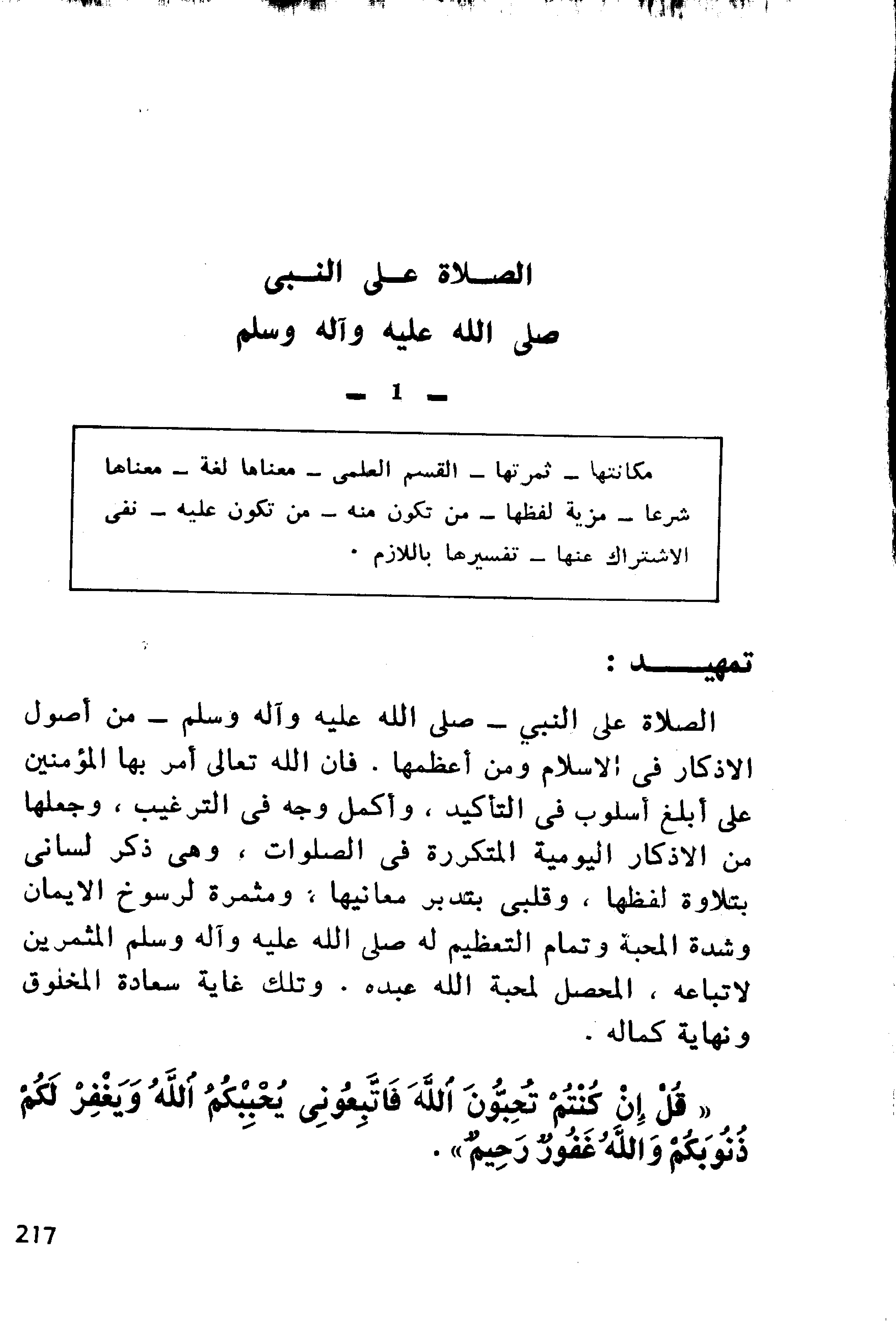 وقوله - صلى الله عليه وسلم- «لا صلاة لجار المسجد في غير المسجد» مراداً به عبادة مخصوصة ذات أقوال وأفعال وتروك على هيئة خاصة من جملة أجزائها الدعاء. ولا شك أن إطلاقها على هذا المعنى إنما هو إطلاق شرعي ولكنه غير خارج عن أساليب كلام العرب، فإنه من باب تسمية الشيء باسم جزئه، فإطلاق هذا اللفظ على هذه العبادة المخصوصة حقيقة شرعية، مجاز لغوي، وليس هذا هو مرادنا هنا. وقد كان الظاهر لما كانت بمعنى الدعاء أن تتعدى بالكلام ولكنها تعدت بعلى لما فيها من معنى العطف، فصلى عليه يؤدي معنى قولنا: دعا له عاطفاً عليه وهذا هو السر في اختيار لفظها على لفظه لتؤدي المعنيين: الدعاء والعطف. وإن كان لفظ الدعاء يقتضي عطفاً فذلك بطريق الاستلزام، وهو دون دلالة التضمن.