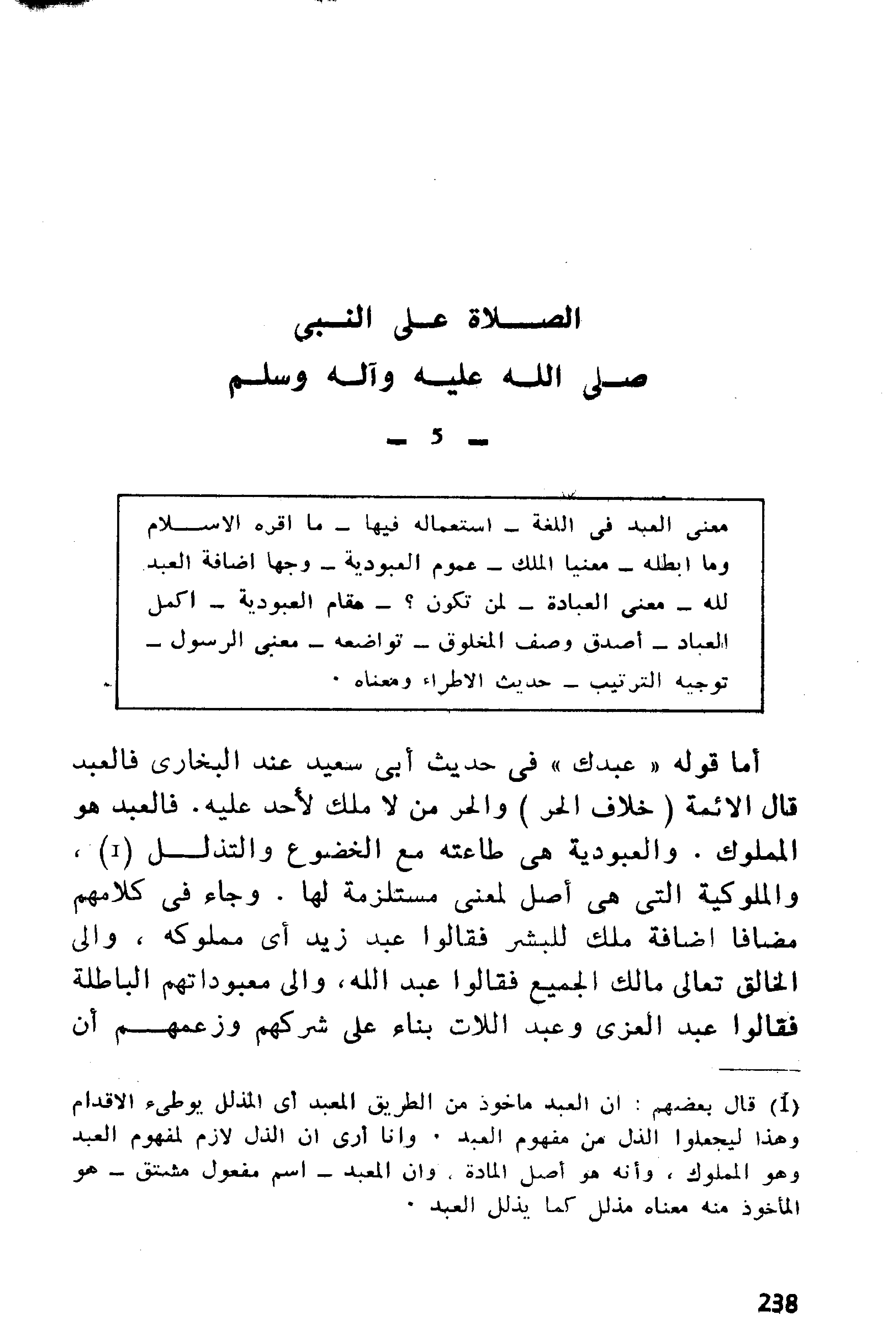 ولما كانت الطاعة -التي هي العبادة- بها يحصل الكمال الإنساني للفرد في عقله وأخلاقه وأعماله، وللنوع في اجتماعه وعمرانه، وهذا الكمال هو سعادة الدنيا المفضية إلى السعادة الكبرى في الحياة الأخرى - كانت العبودية أشرف حال وأعظم مقام وأفضل وصف للإنسان وكان أفضل إنسان أرسخ الناس قدما في هذا المقام. ولما كان النبي- صلى الله عليه وآله وسلم- كذلك كان أفضل الخلق، وكان -كما قال- صلى الله عليه وآله وسلم-: «سيد ولد آدم ولا فخر» - ولهذا ذكر بوصف العبودية في مقام التقريب والتكريم في قوله تعالى: {فَأَوْحَى إِلَى عَبْدِهِ مَا أَوْحَى} وفي مقام الترفيع والتعظيم في آية الإسراء، وجاء على مقتضى ذلك وصفه به في ذكر الصلاة ومقام الثناء والدعاء.