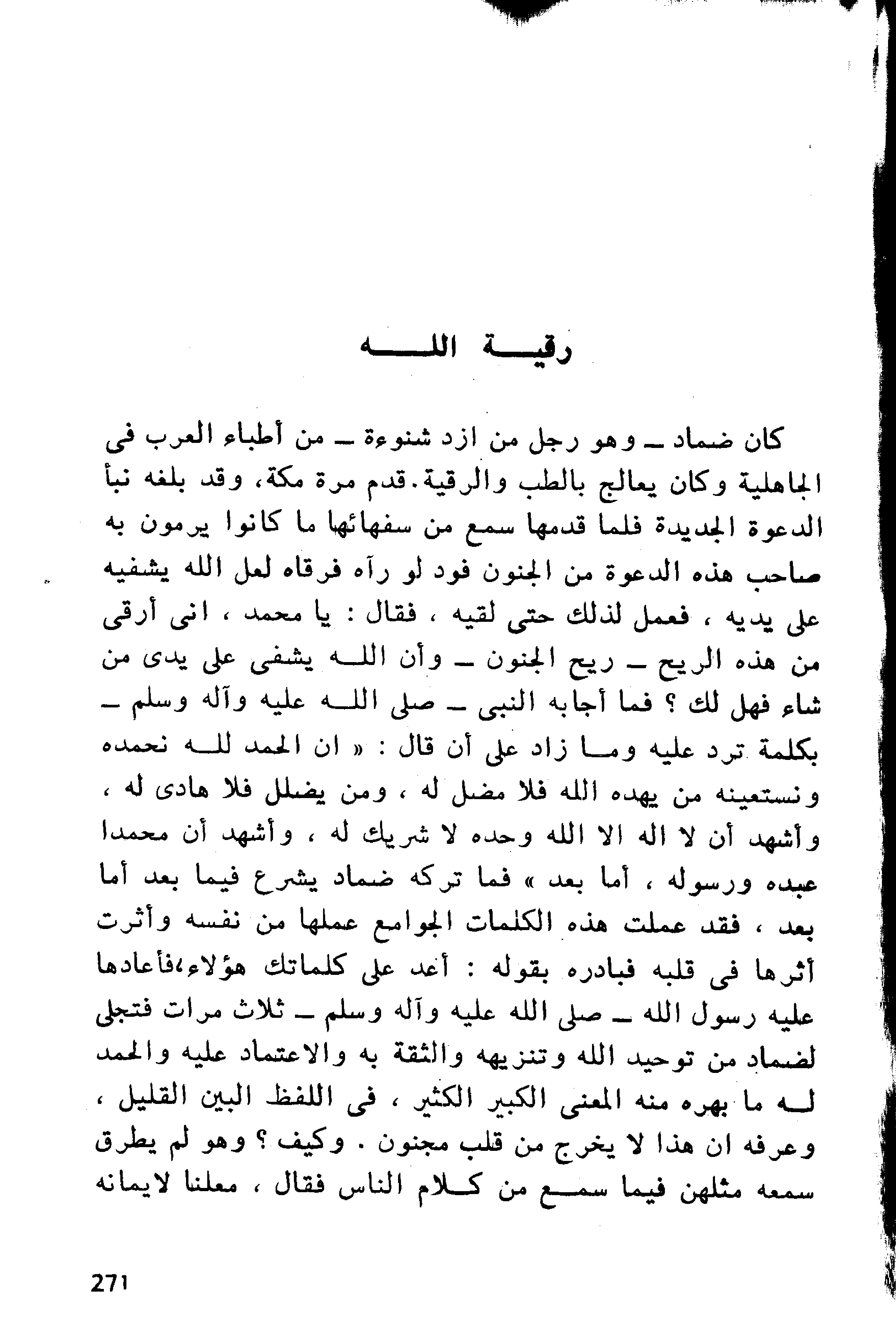 وآله وسلم- لم يزد في استشفاء ضماد على أسماعه ذلك الكلام الجامع المختصر. فعلى الدعاة إلى الحق أن تكون دعوتهم بكلام الله ومثل هذه الكلمات من حديث رسول الله- صلى الله عليه وآله وسلم- فإن في ذلك الاتباع والانتفاع، وحصول الهداية إن شاء الله آمين (1).