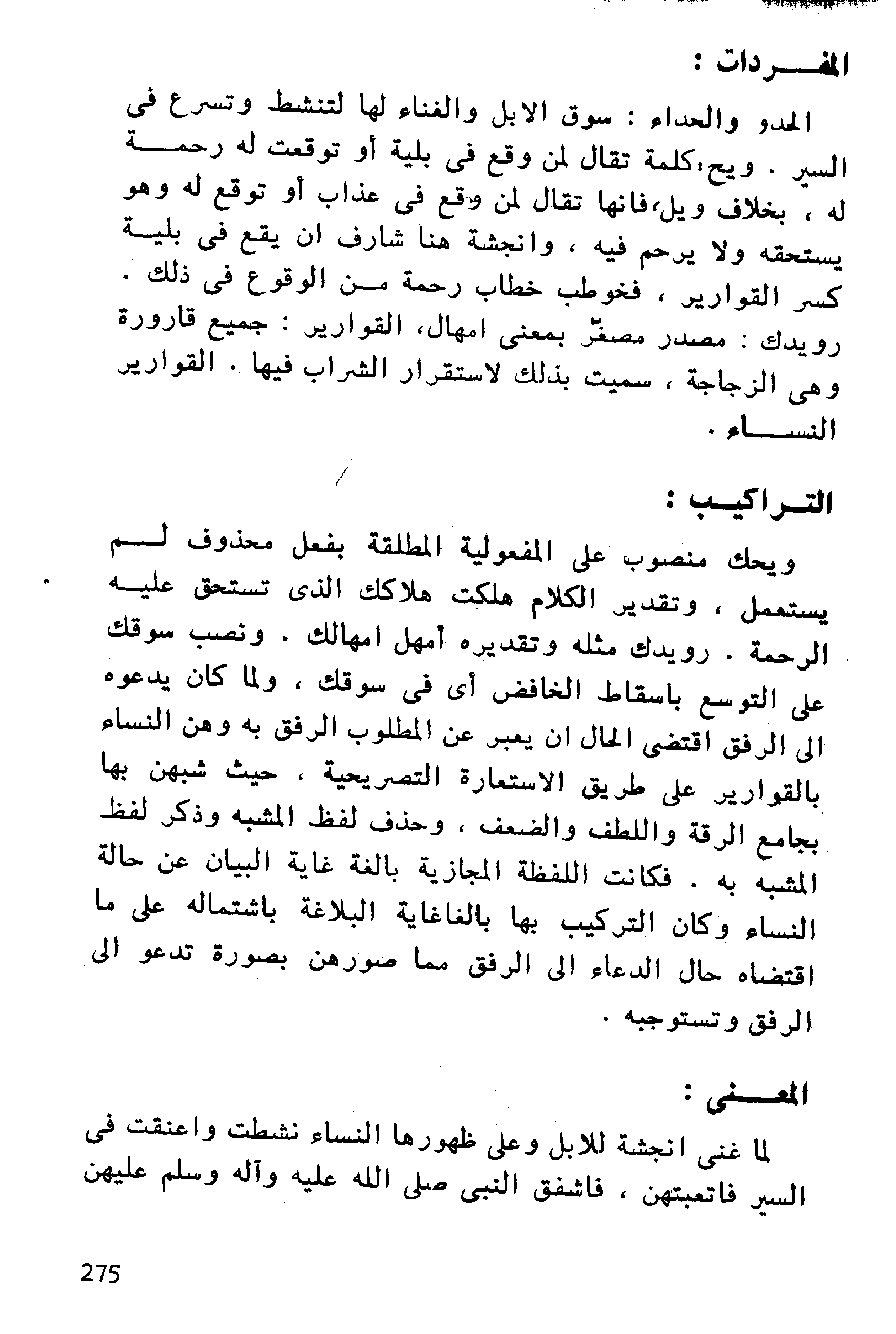 وآله وسلم- فوصف المرأة والماء الذي مزجت به الخمرة، والناقة وصورها تصويرا فنيا ولم ينكر عليها (1) لأنه لم يكن يصف شخصا معينا يؤدي وصفه إلى اثارة الشهوة البهيمية نحوه وإنما كان يعرض صوراً من محاسن تلك الأشياء التي تلذ للنفوس البشرية صورها الجمالية وتنمي فيها قوة الشعور والذوق.