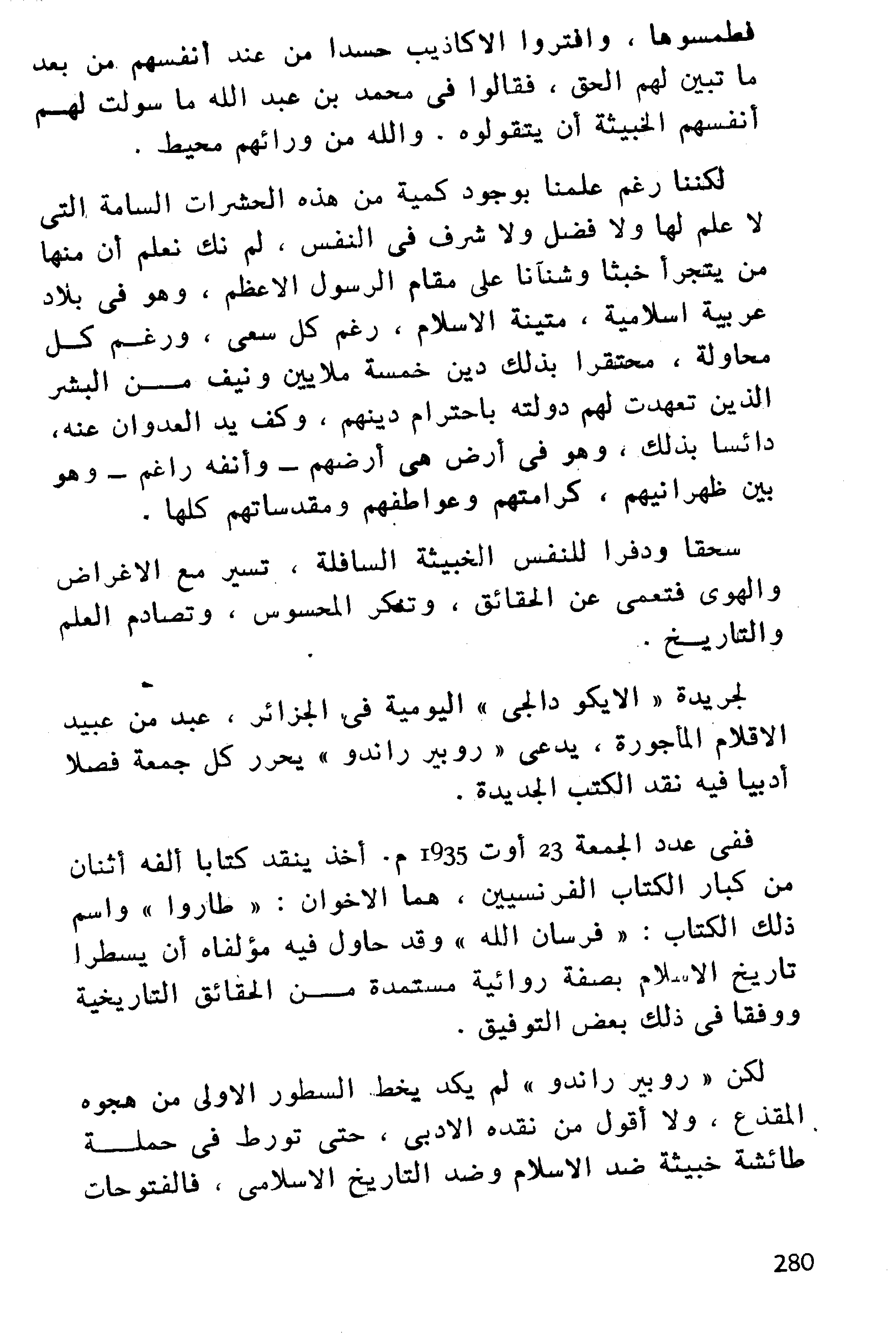 إن مثل هذه الكلمات السافلة توشك أن تحدث فتنة نحن في غنى عنها، وشر الفتن ما كان مصدره الغضب للدين. وإننا لتمنعنا آدابنا الإسلامية، وتعاليمنا الراقية من أن ننحط لمثل هذا الميدان فنشتم دين الذي يشتم ديننا، ونحقر اعتقاد الذي يحقر اعتقادنا، ونصف رسل الأمم الأخرى- صلوات الله وسلامه عليهم- بمثل ما يصف رجال الأمم الأخرى رسولنا.