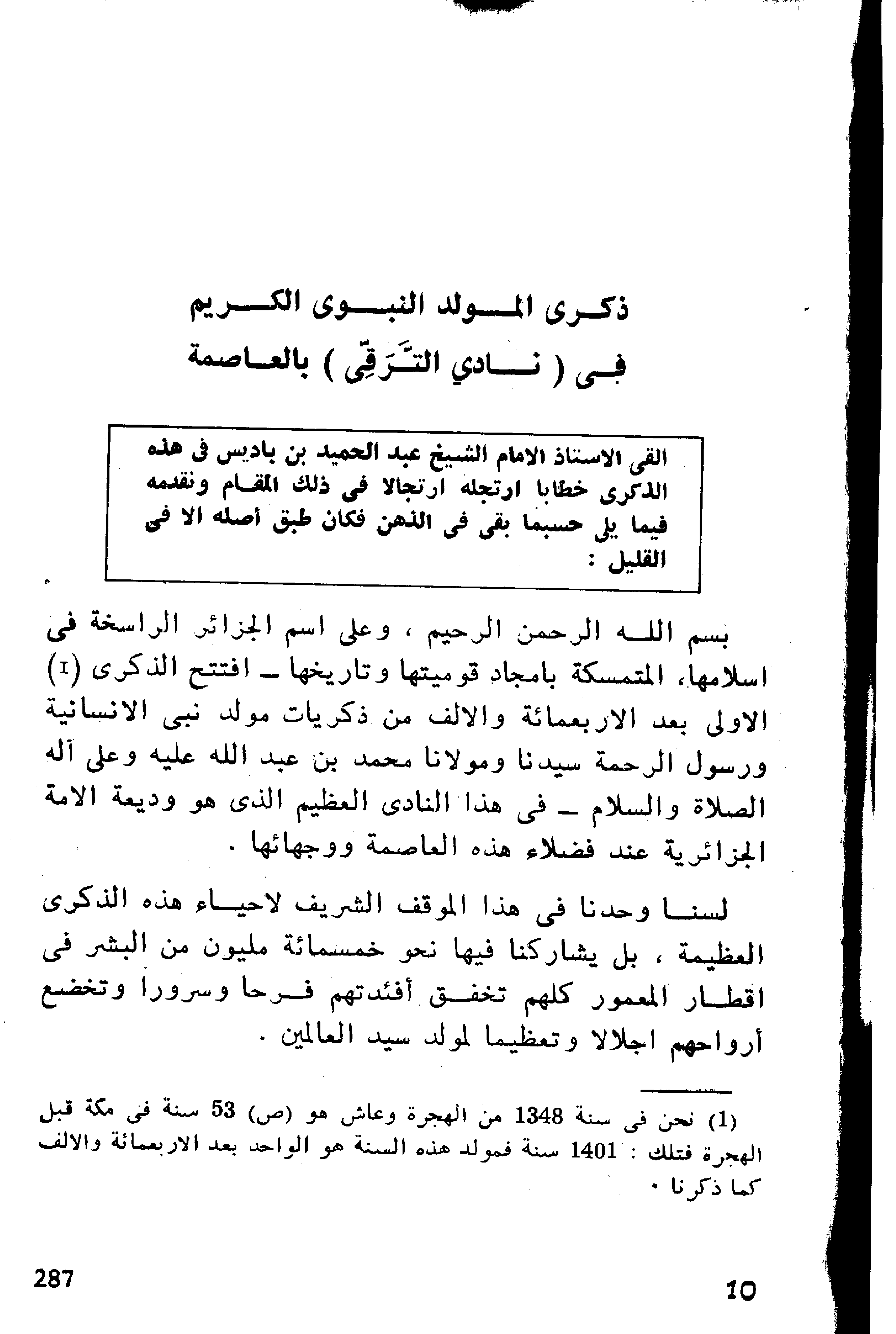 فالإسلام الذي جاء به صاحب هذه الذكرى هو أبو المدنية أمس واليوم - وأعني بمدنية اليوم المدنية من جهة العلم والعمران، لا من جهة الأخلاق والاجتماع فهنالك ما يتبرأ منه الإسلام.