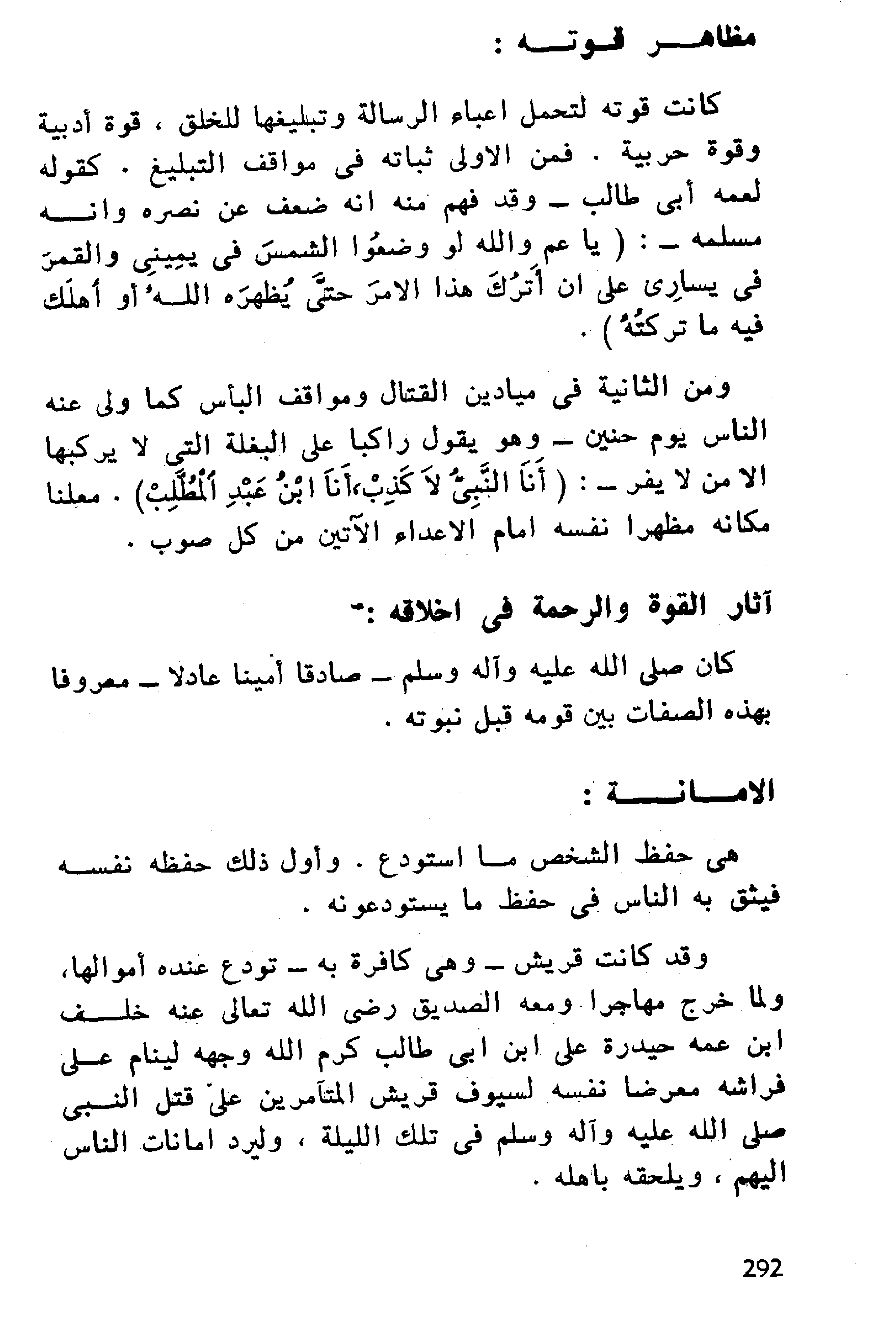 ولو تتبعت أصول شريعته وفروعها وآدابها لوجدتها كلها مبنية على أساسي الرحمة والقوة. فليس من الإسلام ذلك التماوت وذلك التمسكن الذي يتظاهر به بعض الناس. وقد قال عمر بن الخطاب- رضي الله عنه- وقد رأى قوما من هذا الصنف: "لا تميتوا علينا ديننا أماتكم الله"، وقالت عائشة- رضي الله تعالى عنها- وقد رأت قوما يتماوتون في مشيتهم