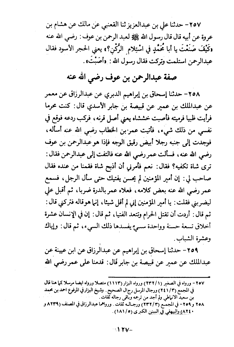258 - حَدَّثَنَا إِسْحَاقُ بْنُ إِبْرَاهِيمَ الدَّبَرِيُّ، عَنْ عَبْدِ الرَّزَّاقِ، عَنْ مَعْمَرٍ، عَنْ عَبْدِ الْمَلِكِ بْنِ عُمَيْرٍ، عَنْ قَبِيصَةَ بْنِ جَابِرٍ الْأَسَدِيِّ، قَالَ: كُنْتُ مُحْرِمًا فَرَأَيْتُ ظَبْيًا فَرَمَيْتُهُ، فَأَصَبْتُ خَشَشَاهُ - يَعْنِي أَصْلَ قَرْنِهِ - فَرَكِبَ رَدْعَهُ، فَوَقَعَ فِي نَفْسِي مِنْ ذَلِكَ شَيْءٌ، فَأَتَيْتُ عُمَرَ بْنَ الْخَطَّابِ رَضِيَ اللهُ عَنْهُ أَسْأَلُهُ، فَوَجَدْتُ إِلَى جَنْبِهِ رَجُلًا أَبْيَضَ رَقِيقَ الْوَجْهِ، فَإِذَا هُوَ عَبْدُ الرَّحْمَنِ بْنُ عَوْفٍ رَضِيَ اللهُ عَنْهُ، فَسَأَلْتُ عُمَرَ رَضِيَ اللهُ عَنْهُ، فَالْتَفَتَ إِلَى عَبْدِ الرَّحْمَنِ فَقَالَ: «§تَرَى شَاةً تَكْفِيهِ؟» فَقَالَ: نَعَمْ، فَأَمَرَنِي أَنْ أَذْبَحَ شَاةً، فَقُمْنَا مِنْ عِنْدِهِ، فَقَالَ صَاحِبٌ لِي: إِنَّ أَمِيرَ الْمُؤْمِنِينَ لَمْ يُحْسِنْ يُفْتِيكَ، حَتَّى سَأَلَ الرَّجُلَ، فَسَمِعَ عُمَرُ رَضِيَ اللهُ عَنْهُ بَعْضَ كَلَامِهِ، فَعَلَاهُ عُمَرُ بِالدِّرَّةِ ضَرْبًا، ثُمَّ أَقْبَلَ عَلَيَّ لِيَضْرِبَنِي، فَقُلْتُ: يَا أَمِيرَ الْمُؤْمِنِينَ، إِنِّي لَمْ أَقُلْ شَيْئًا إِنَّمَا هُوَ قَالَهُ، فَتَرَكَنِي، قَالَ: ثُمَّ قَالَ: «أَرَدْتَ أَنْ تَقْتُلَ الْحَرَامَ وَتَتَعَدَّ الْفُتْيَا» ، ثُمَّ قَالَ: " إِنَّ فِي الْإِنْسَانِ عَشَرَةَ أَخْلَاقٍ: تِسْعَةٌ حَسَنَةٌ، وَوَاحِدَةٌ سَيِّئَةٌ يُفْسِدُهَا ذَلِكَ السَّيِّءُ "، ثُمَّ قَالَ: «وَإِيَّاكَ وَعِشْرَةَ الشَّبَابِ»