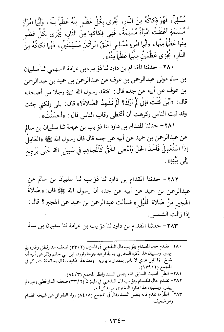 280 - حَدَّثَنَا الْمِقْدَامُ بْنُ دَاوُدَ، ثنا ذُؤَيْبُ بْنُ عِمَامَةَ السَّهْمِيُّ، ثنا سُلَيْمَانُ بْنُ سَالِمٍ، مَوْلَى عَبْدِ الرَّحْمَنِ بْنِ عَوْفٍ، عَنْ عَبْدِ الرَّحْمَنِ بْنِ حُمَيْدِ بْنِ عَبْدِ الرَّحْمَنِ بْنِ عَوْفٍ، عَنْ أَبِيهِ، عَنْ جَدِّهِ، قَالَ: افْتَقَدَ رَسُولُ اللهِ صَلَّى اللهُ عَلَيْهِ وَسَلَّمَ رَجُلًا مِنْ أَصْحَابِهِ، قَالَ: «أَيْنَ كُنْتَ؟ فَإِنِّي لَمْ أَرَكَ؟ أَلَمْ تَشْهَدِ الصَّلَاةَ؟» قَالَ: بَلَى. وَلَكِنِّي جِئْتُ وَقَدْ ثَبَتَ النَّاسُ، §وَكَرِهْتُ أَنْ أَتَخَطَّى رِقَابَ النَّاسِ، قَالَ: «أَحْسَنْتَ»