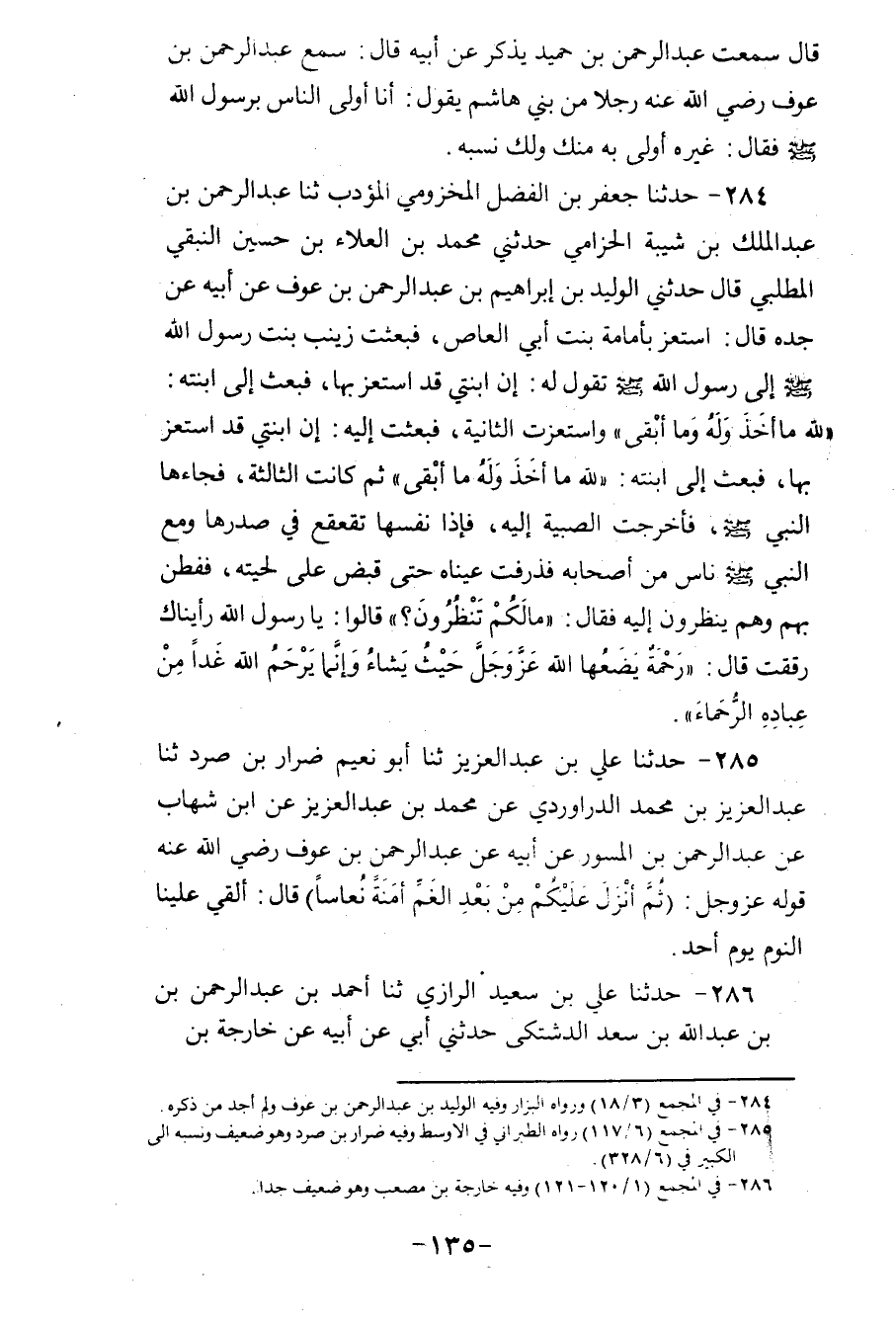 284 - حَدَّثَنَا جَعْفَرُ بْنُ الْفَضْلِ الْمَخْزُومِيُّ الْمُؤَدِّبُ، ثنا عَبْدُ الرَّحْمَنِ بْنُ عَبْدِ الْمَلِكِ بْنِ شَيْبَةَ الْحِزَامِيُّ، حَدَّثَنِي مُحَمَّدُ بْنُ الْعَلَاءِ بْنِ حُسَيْنٍ النَّبِقِيُّ الْمُطَّلِبِيُّ، قَالَ: حَدَّثَنِي الْوَلِيدُ بْنُ إِبْرَاهِيمَ بْنِ عَبْدِ الرَّحْمَنِ بْنِ عَوْفٍ، عَنْ أَبِيهِ، عَنْ جَدِّهِ، قَالَ: اسْتُعِزَّ بِأُمَامَةَ بِنْتِ أَبِي الْعَاصِ، فَبَعَثَتْ زَيْنَبُ بِنْتُ رَسُولِ اللهِ صَلَّى اللهُ عَلَيْهِ وَسَلَّمَ إِلَى رَسُولِ اللهِ صَلَّى اللهُ عَلَيْهِ وَسَلَّمَ تَقُولُ لَهُ: إِنَّ ابْنَتِي قَدِ اسْتُعِزَّ بِهَا، فَبَعَثَ إِلَى ابْنَتِهِ: «§لِلَّهِ مَا أَخَذَ وَلَهُ وَمَا أَبْقَى» وَاسْتُعِزَّتِ الثَّانِيَةُ، فَبَعَثَتْ إِلَيْهِ: إِنَّ ابْنَتِي قَدِ اسْتُعِزَّ بِهَا، فَبَعَثَ إِلَى ابْنَتَهِ: «للَّهِ مَا أَخَذَ وَلَهُ مَا أَبْقَى» ثُمَّ كَانَتِ الثَّالِثَةُ، فَجَاءَهَا النَّبِيُّ صَلَّى اللهُ عَلَيْهِ وَسَلَّمَ فَأَخْرَجَتِ الصِّبْيَةَ إِلَيْهِ، فَإِذَا نَفْسُهَا تَقَعْقَعُ فِي صَدْرِهَا، وَمَعَ النَّبِيِّ صَلَّى اللهُ عَلَيْهِ وَسَلَّمَ نَاسٌ مِنْ أَصْحَابِهِ، فَذَرَفَتْ عَيْنَاهُ حَتَّى قَبَضَ عَلَى لِحْيَتِهِ، فَفَطِنَ بِهِمْ وَهُمْ يَنْظُرُونَ إِلَيْهِ، فَقَالَ: «مَا لَكُمْ تَنْظُرُونَ؟» قَالُوا: يَا رَسُولَ اللهِ رَأَيْنَاكَ رَقَقْتَ. قَالَ: «رَحْمَةٌ يَضَعُهَا اللهُ عَزَّ وَجَلَّ حَيْثُ يَشَاءُ، وَإِنَّمَا يَرْحَمُ اللهُ غَدًا مِنْ عِبَادِهِ الرُّحَمَاءَ»