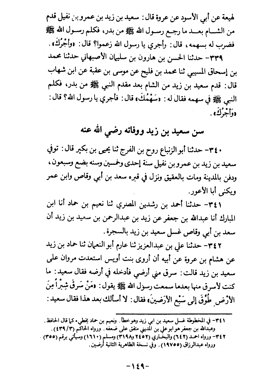 340 - حَدَّثَنَا أَبُو الزِّنْبَاعِ رَوْحُ بْنُ الْفَرَجِ، ثنا يَحْيَى بْنُ بُكَيْرٍ، قَالَ: «§تُوُفِّيَ سَعِيدُ بْنُ زَيْدِ بْنِ عَمْرِو بْنِ نُفَيْلٍ سَنَةَ إِحْدَى وَخَمْسِينَ وَسَنَةَ بِضْعٍ وَسَبْعِينَ، وَدُفِنَ بِالْمَدِينَةِ، وَمَاتَ بِالْعَقِيقِ، وَنَزَلَ فِي قَبْرِهِ سَعْدُ بْنُ أَبِي وَقَّاصٍ، وَابْنُ عُمَرَ وَيُكَنَّى أَبَا الْأَعْوَرِ»
