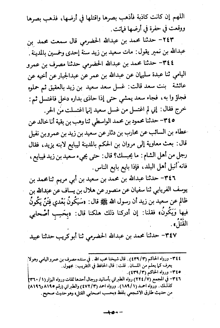 343 - حَدَّثَنَا مُحَمَّدُ بْنُ عَبْدِ اللهِ الْحَضْرَمِيُّ، قَالَ: سَمِعْتُ مُحَمَّدَ بْنَ عَبْدِ اللهِ بْنِ نُمَيْرٍ، يَقُولُ: «§مَاتَ سَعِيدُ بْنُ زَيْدٍ سَنَةَ إِحْدَى وَخَمْسِينَ بِالْمَدِينَةِ»