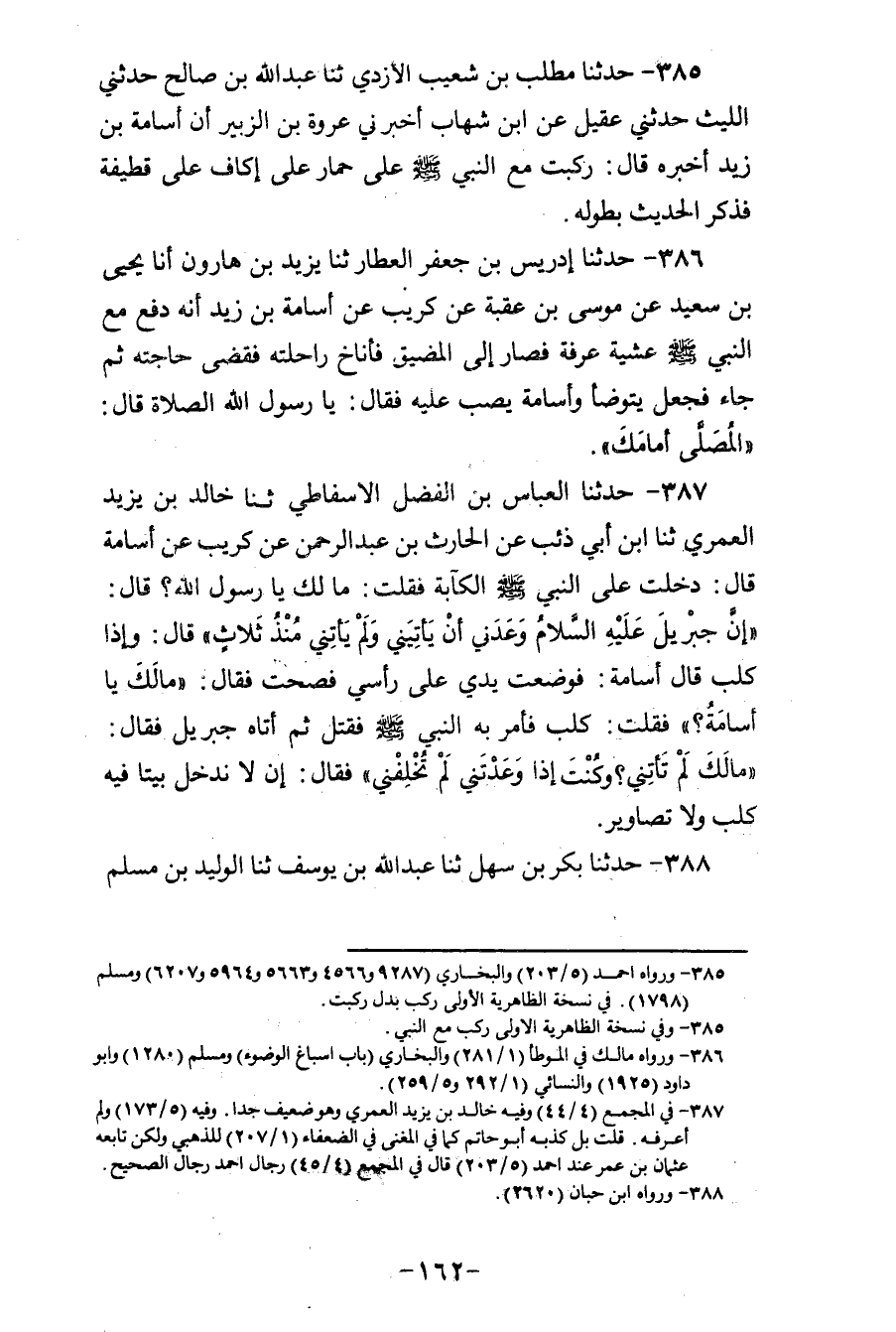 387 - حَدَّثَنَا الْعَبَّاسُ بْنُ الْفَضْلِ الْأَسْفَاطِيُّ، ثنا خَالِدُ بْنُ يَزِيدَ الْعُمَرِيُّ، ثنا ابْنُ أَبِي ذِئْبٍ، عَنِ الْحَارِثِ بْنِ عَبْدِ الرَّحْمَنِ، عَنْ كُرَيْبٍ، عَنْ أُسَامَةَ، قَالَ: دَخَلَتْ عَلَى النَّبِيِّ صَلَّى اللهُ عَلَيْهِ وَسَلَّمَ الْكَآبَةُ، فَقُلْتُ: مَا لَكَ يَا رَسُولَ اللهِ؟ قَالَ: «إِنَّ جِبْرِيلَ عَلَيْهِ السَّلَامُ وَعَدَنِي أَنْ يَأْتِيَنِي وَلَمْ يَأْتِنِي مُنْذُ ثَلَاثٍ» . قَالَ: وَإِذَا كَلْبٌ، قَالَ أُسَامَةُ: فَوَضَعْتُ يَدِي عَلَى رَأْسِي فَصِحْتُ، فَقَالَ: «مَا لَكَ يَا أُسَامَةُ؟» فَقُلْتُ: كَلْبٌ. فَأَمَرَ بِهِ النَّبِيُّ صَلَّى اللهُ عَلَيْهِ وَسَلَّمَ، فَقُتِلَ، ثُمَّ أَتَاهُ جِبْرِيلُ، فَقَالَ: " مَا لَكَ لَمِ تَأْتِنِي، وَكُنْتَ إِذَا وَعَدْتَنِي لَمْ تُخْلِفْنِي، فَقَالَ: §إِنَّا لَا نَدْخُلُ بَيْتًا فِيهِ كَلْبٌ وَلَا تَصَاوِيرُ "