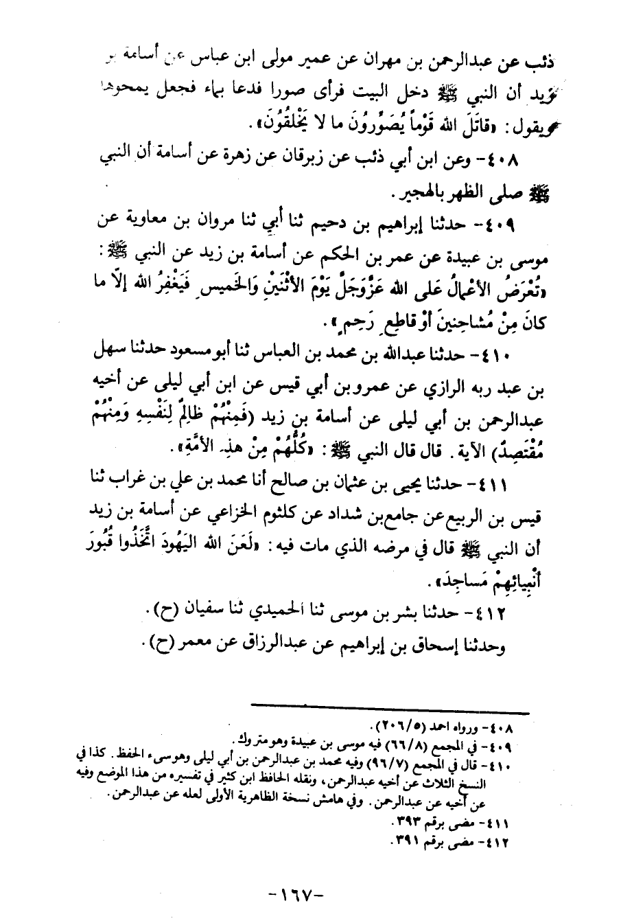 411 - حَدَّثَنَا يَحْيَى بْنُ عُثْمَانَ بْنِ صَالِحٍ، أَنَا مُحَمَّدُ بْنُ عَلِيِّ بْنِ غُرَابٍ، ثنا قَيْسُ بْنُ الرَّبِيعِ، عَنْ جَامِعِ بْنِ شَدَّادٍ، عَنْ كُلْثُومٍ الْخُزَاعِيِّ، عَنْ أُسَامَةَ بْنِ زَيْدٍ، أَنَّ النَّبِيَّ صَلَّى اللهُ عَلَيْهِ وَسَلَّمَ قَالَ فِي مَرَضِهِ الَّذِي مَاتَ فِيهِ: «§لَعَنَ اللهُ الْيَهُودَ اتَّخَذُوا قُبُورَ أَنْبِيَائِهِمْ مَسَاجِدَ»