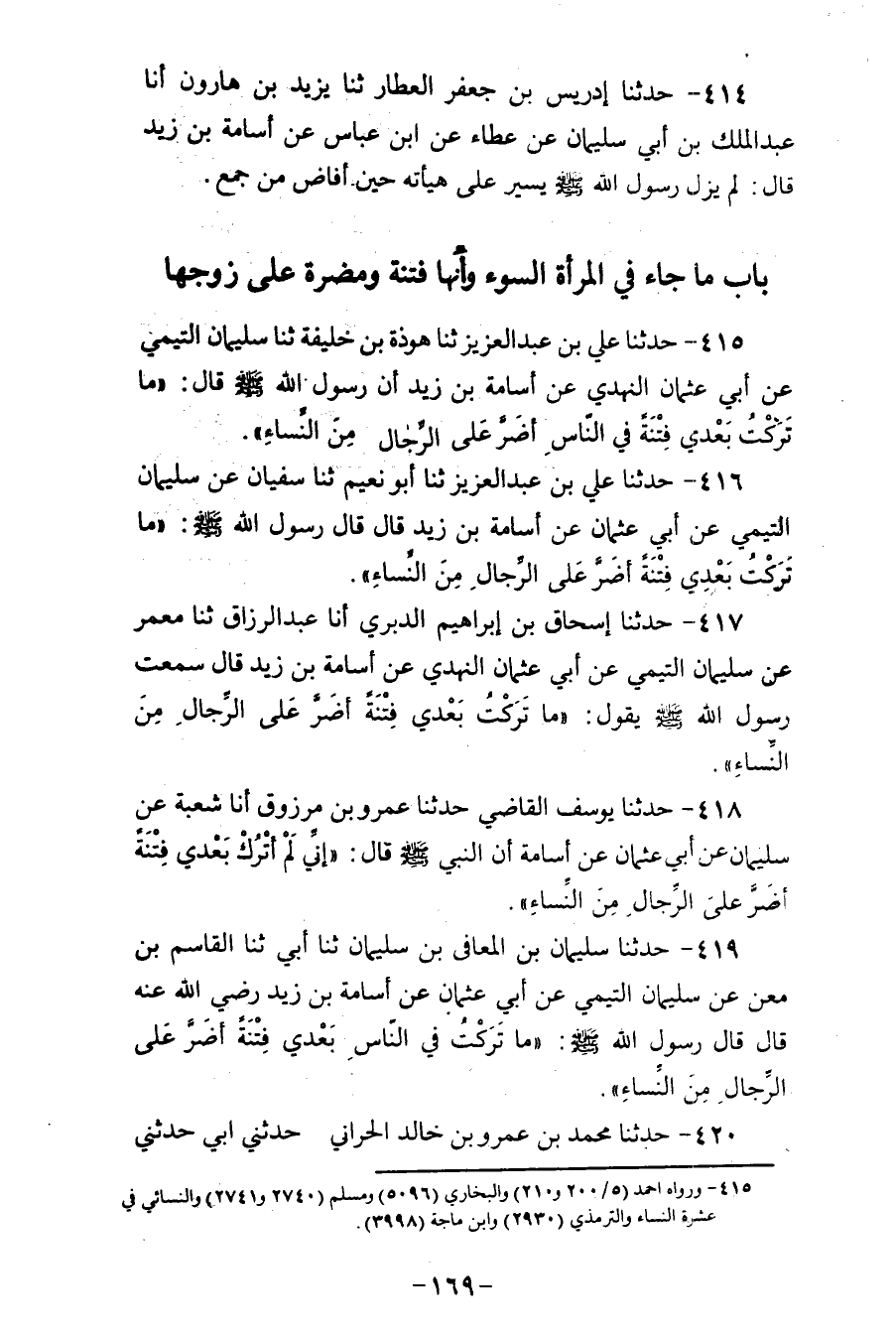 420 - حَدَّثَنَا مُحَمَّدُ بْنُ عَمْرِو بْنِ خَالِدٍ الْحَرَّانِيُّ، حَدَّثَنِي أَبِي، حَدَّثَنِي زُهَيْرٌ، ثنا سُلَيْمَانُ، عَنْ أَبِي عُثْمَانَ النَّهْدِيِّ، عَنْ أُسَامَةَ بْنِ زَيْدٍ، قَالَ: قَالَ رَسُولُ اللهِ صَلَّى اللهُ عَلَيْهِ وَسَلَّمَ: «§مَا تَرَكْتُ بَعْدِي فِتْنَةً أَضَرَّ مِنَ النِّسَاءِ عَلَى الرِّجَالِ»